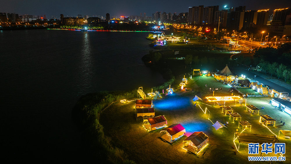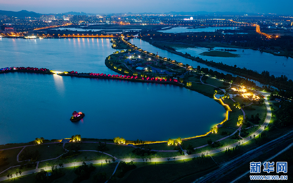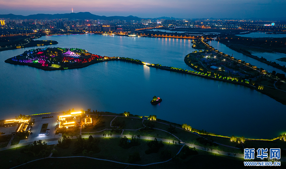 当夜幕降临,安徽省淮北市绿金湖波光粼粼,与沿岸璀璨灯火交相辉映,形成“半湖星辉半湖城”的景象,美不胜收。新华网发(王文 摄)