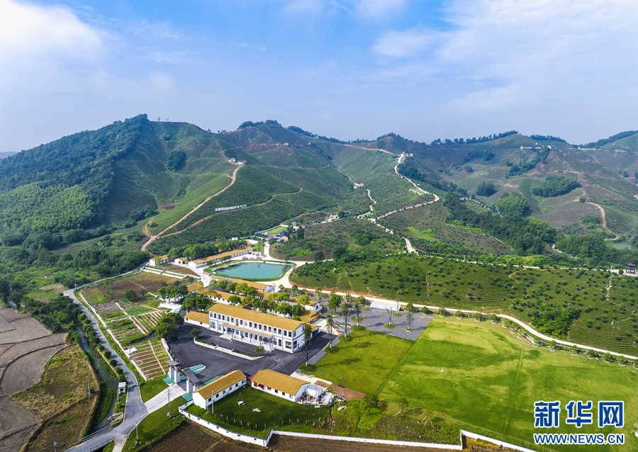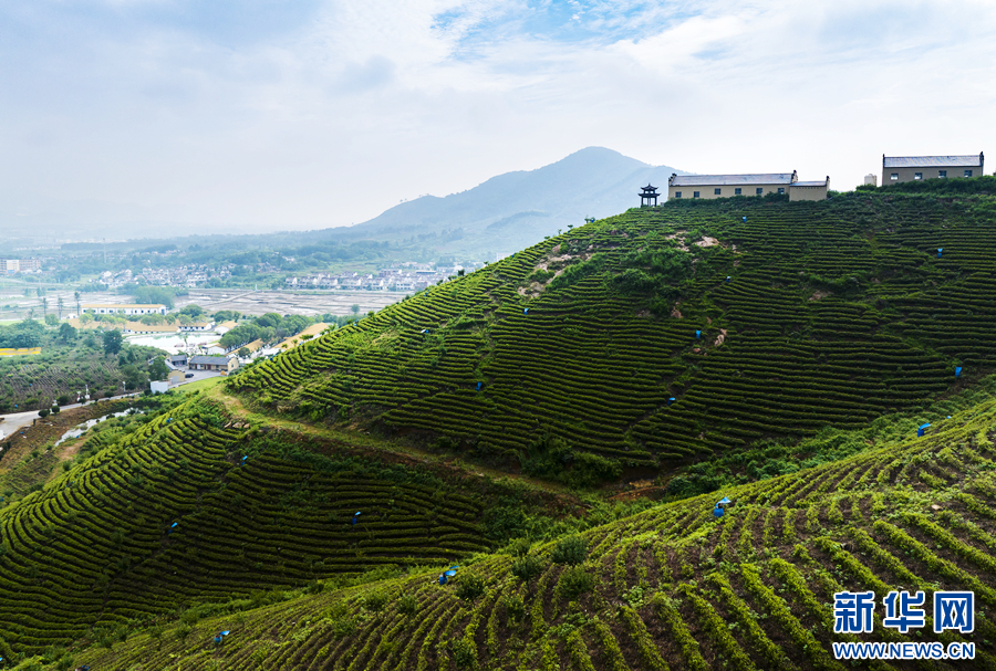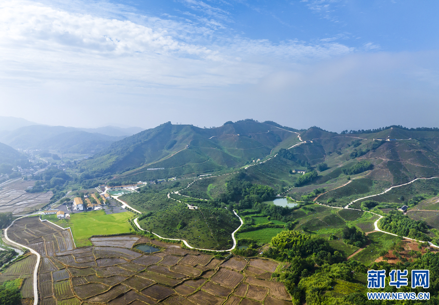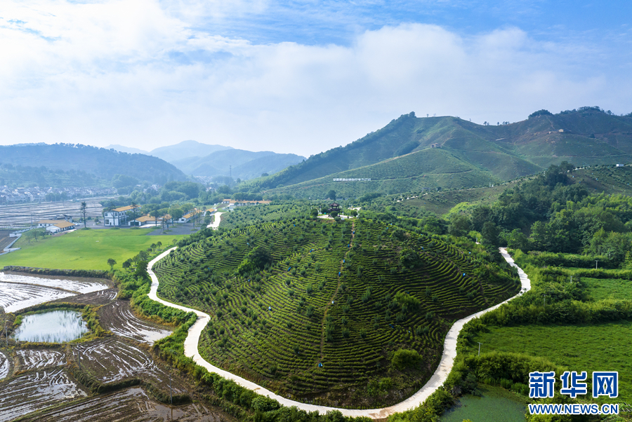 近日,雨后初霁,安徽省芜湖市繁昌区孙村镇梅冲村美景如画。茶园在蓝天白云的映衬下,与周围的群山、村庄构成了一幅诗情画意的生态茶园画卷。新华网发(肖本祥 摄)