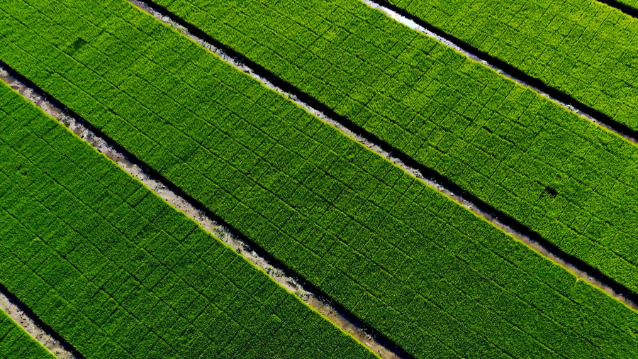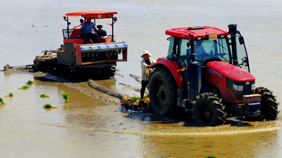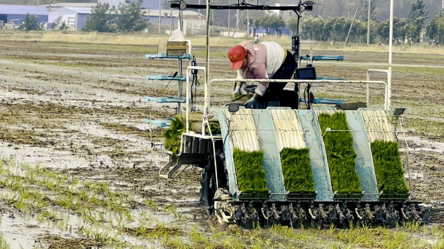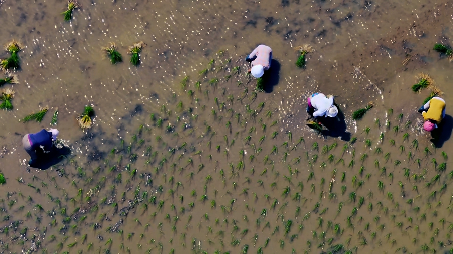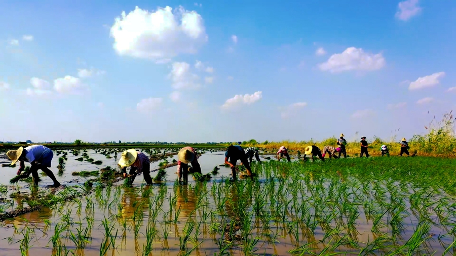 在安徽省颍上县王岗镇,农人们熟练地拔秧、运秧、插秧。微风拂过,青绿的秧苗轻轻摇曳,泛起层层绿波,勾勒出一幅宁静而美好的田园风光。
