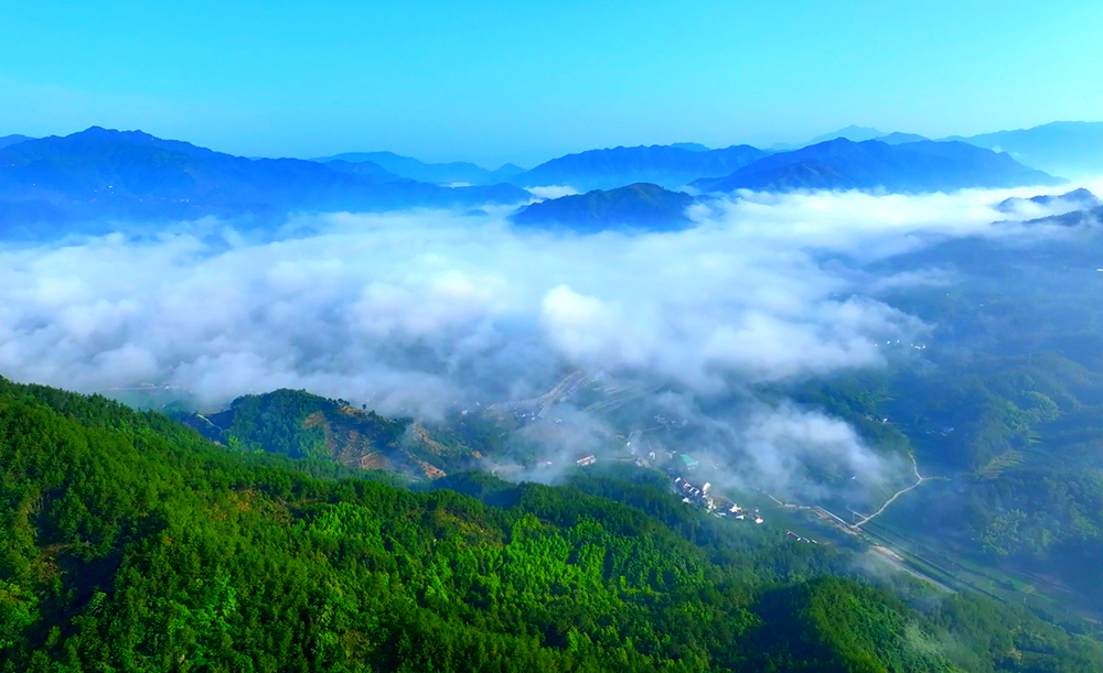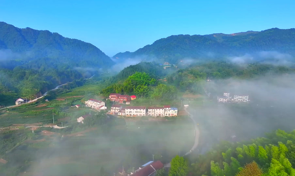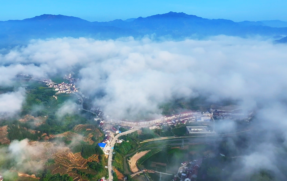 夏日清晨,朝阳初升。安徽省太湖县北中镇在霞光中渐渐苏醒。山间云海如轻纱流淌,聚散舒卷间,远山近舍时隐时现,恰似一幅流动的水墨画卷,令人心旷神怡。