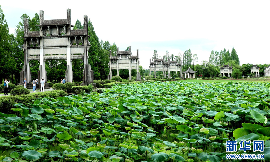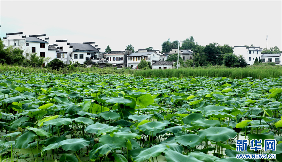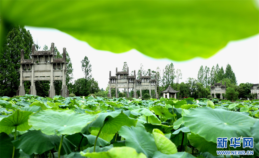 目前,安徽歙县郑村镇棠樾村迎来夏日限定美景——千亩荷塘舒展新绿,田田莲叶层层叠叠,将青砖黛瓦的马头墙与巍峨矗立的牌坊群环抱其中,勾勒出一幅隽永清雅的水墨画卷。新华网发(吴建平 摄)