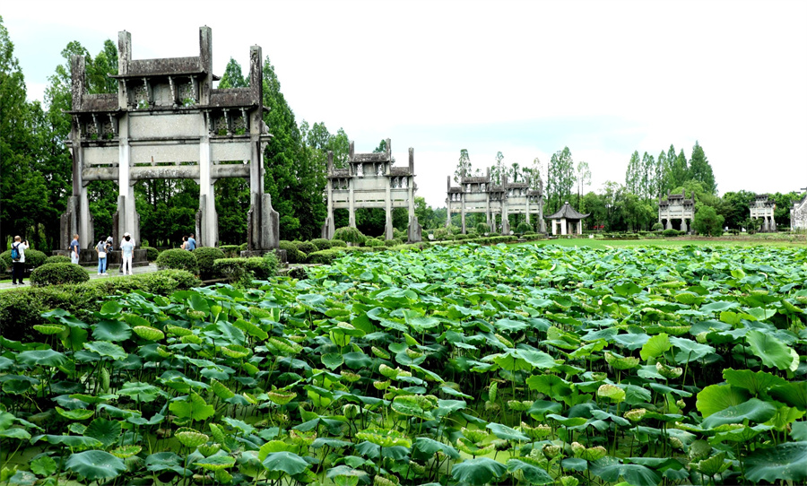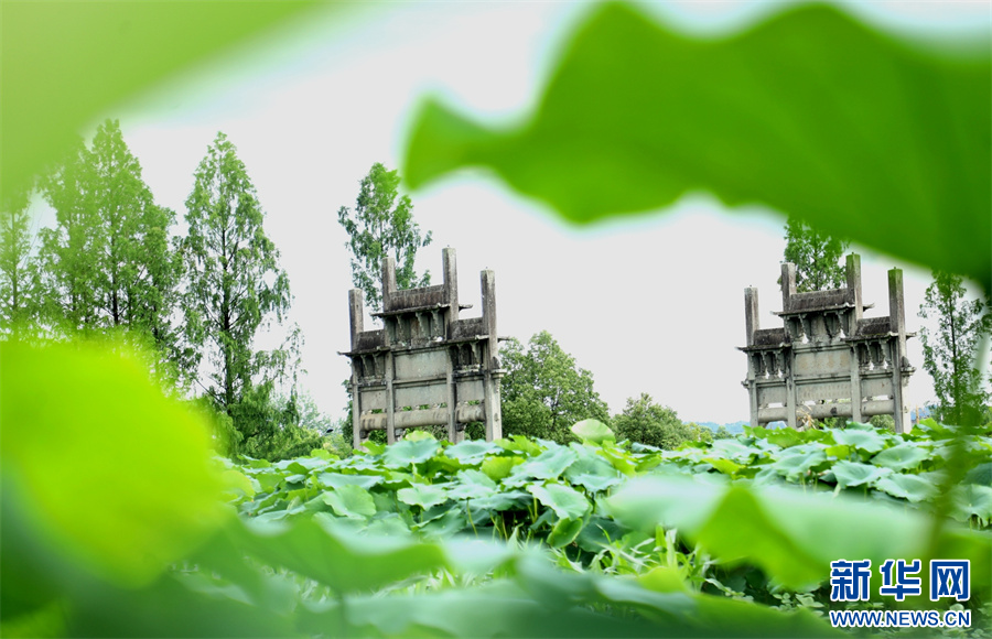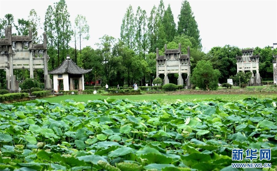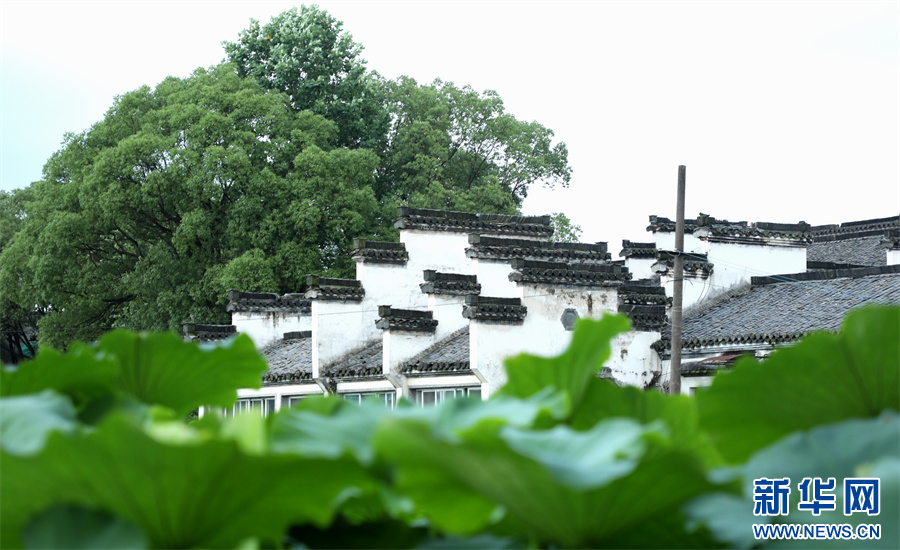 6月24日,安徽歙县郑村镇棠樾村,池塘荷叶映衬着古村落的牌坊和马头墙。