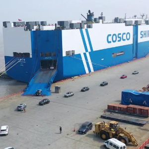 图为一批中国制造的汽车在上海浦东外高桥港装船运往秘鲁钱凯港。(上海海关供图)