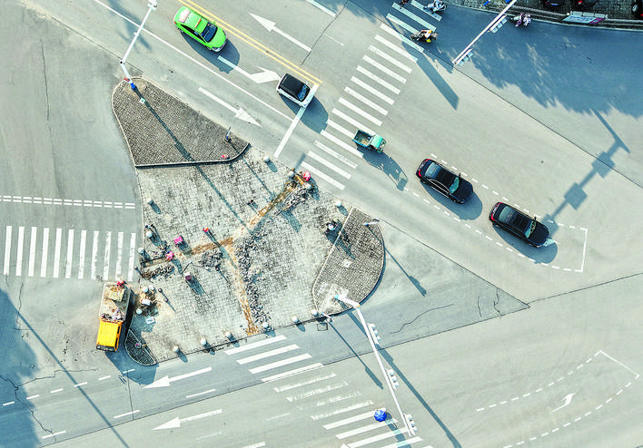 整改过程中,市政管理中心秉持“厘米级”施工标准,重点对导流岛路缘石进行改造。施工人员使用专业设备,通过切割、打磨或调整基础层高度,使路缘石与路面平缓衔接,实现无缝对接。