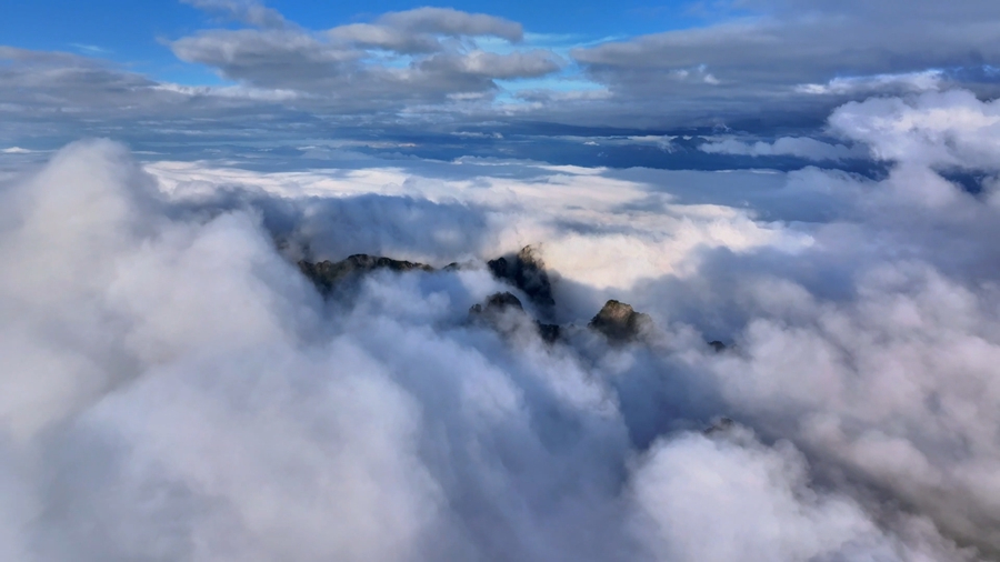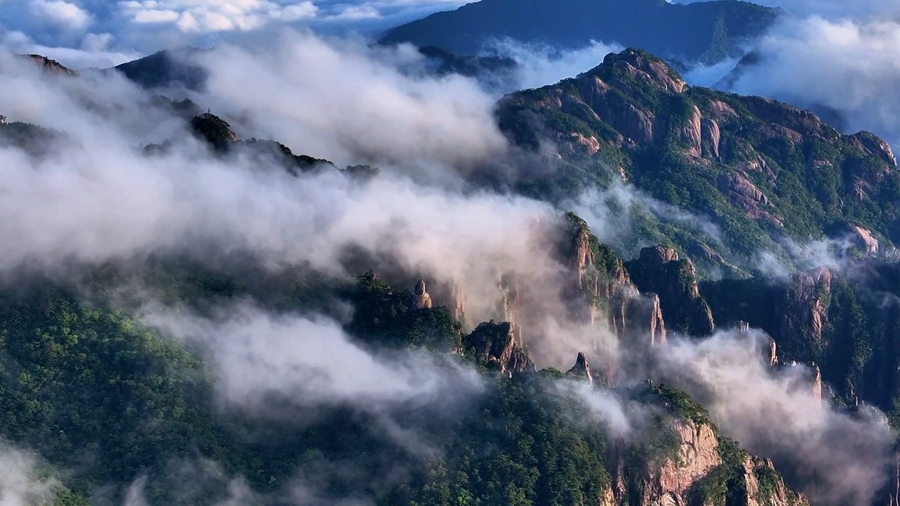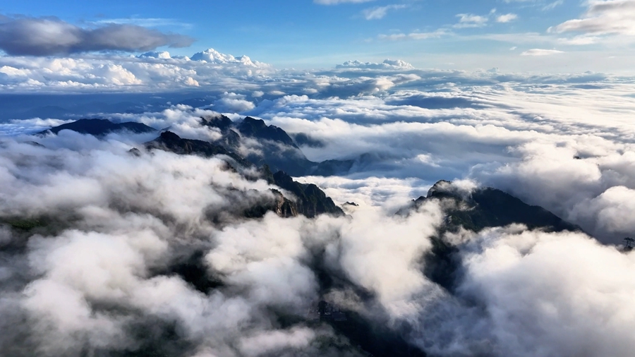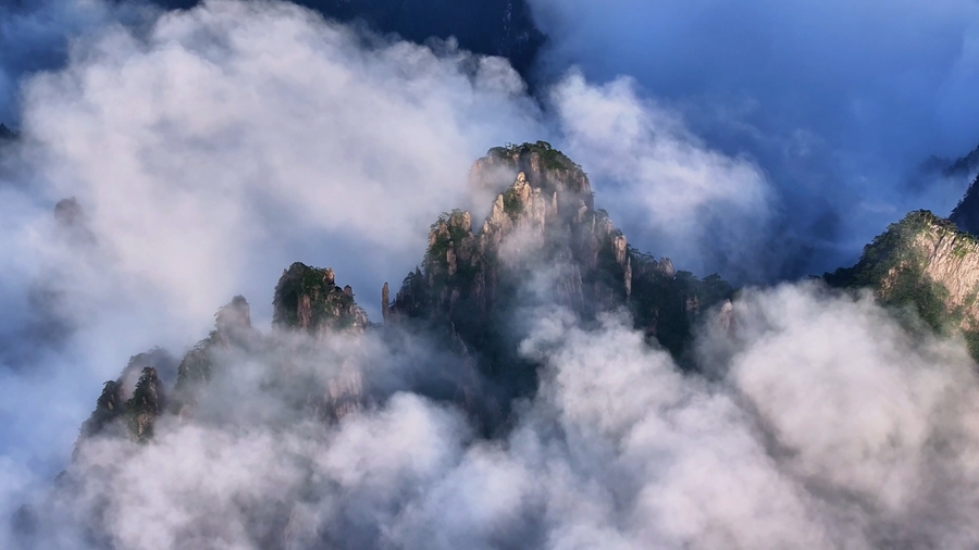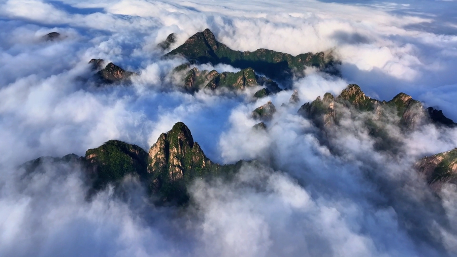 夏日雨后的黄山,开启了一场梦幻云海盛宴。阳光穿透云层,为翻涌的云浪镶上了金边,滔滔云海漫过苍翠松林,千峰万壑似灵动仙岛,在波涛间若隐若现,宛若仙境。