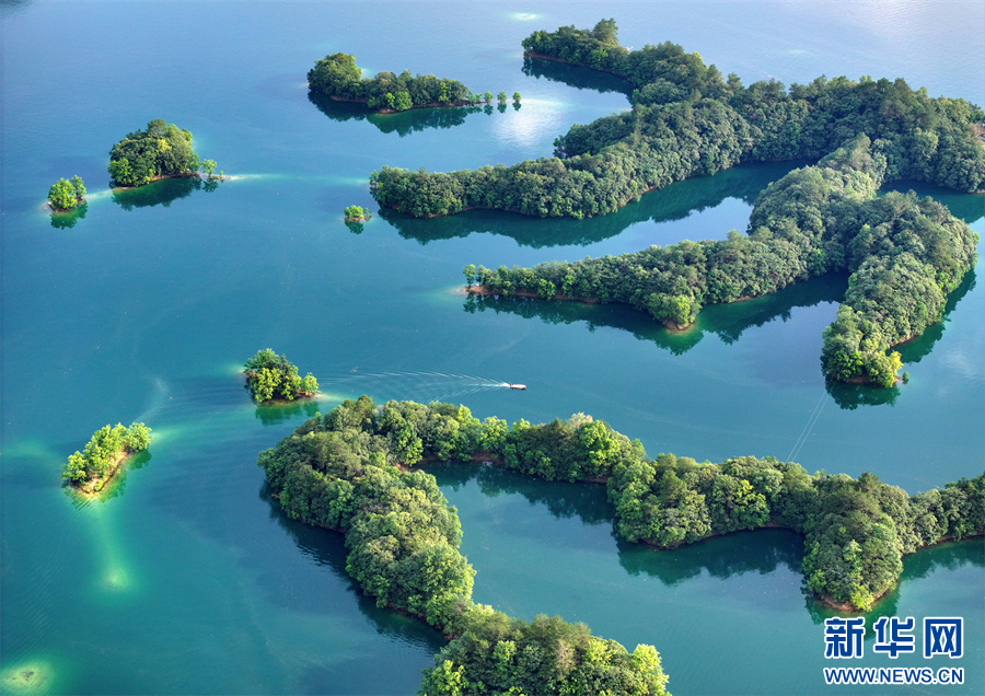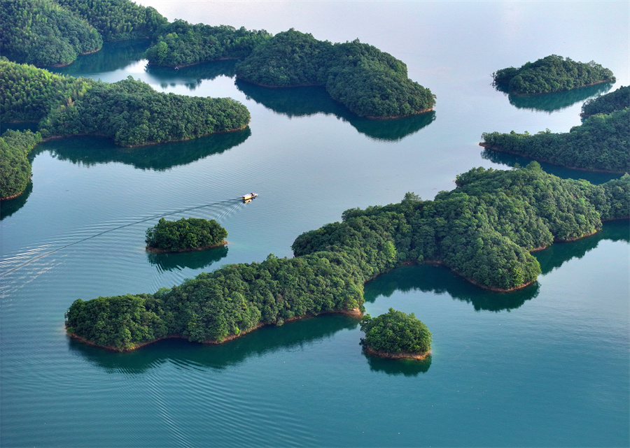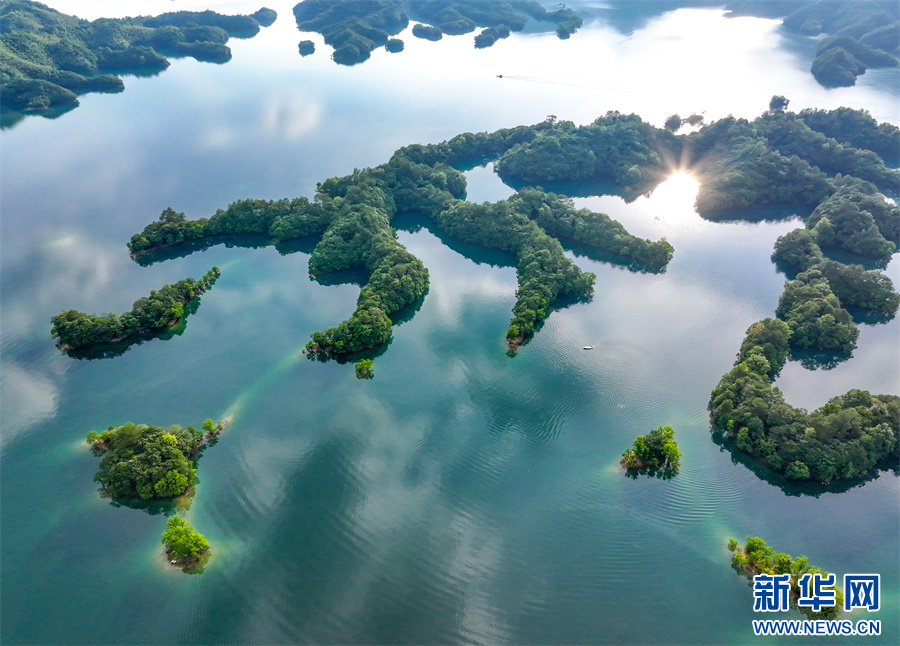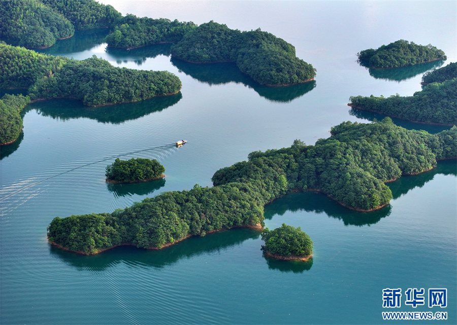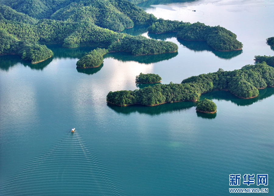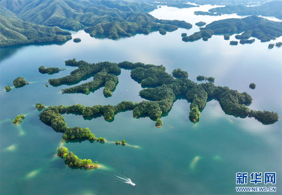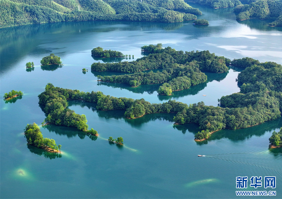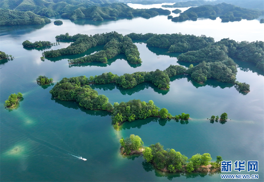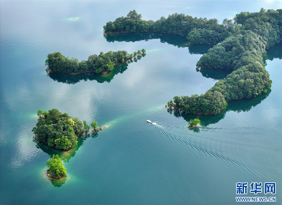 当日,安徽省黄山市黄山区龙门乡秀湖村一带,太平湖碧澈如洗,与青翠岛屿、连绵山峦相映成趣,宛若一幅浑然天成的山水画卷。新华网发(施亚磊 摄)
