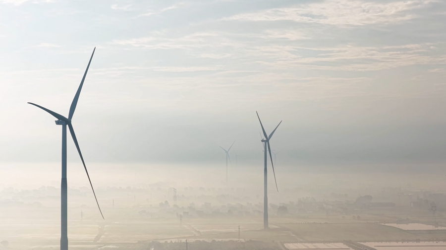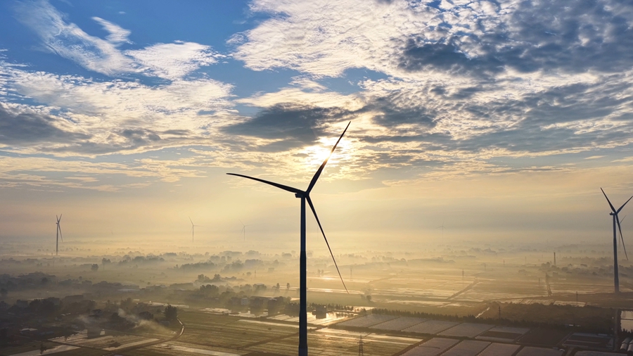 近日,晨光熹微,安徽省颍上县的田间乡野染上了一层油画般的色彩。远处的田地、民居、风力发电机等在金色的薄雾中若隐若现,犹如一幅美丽画卷。(徐红梅)