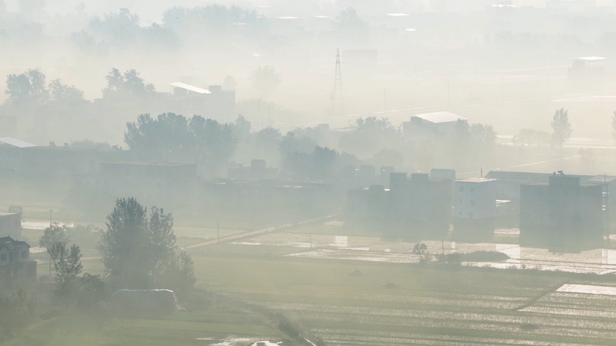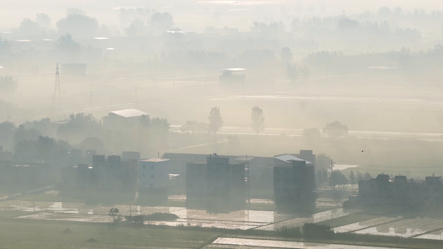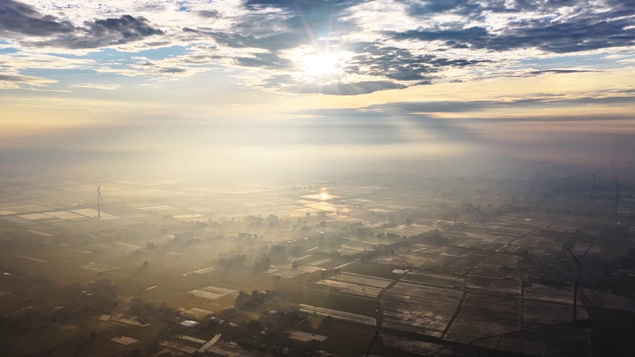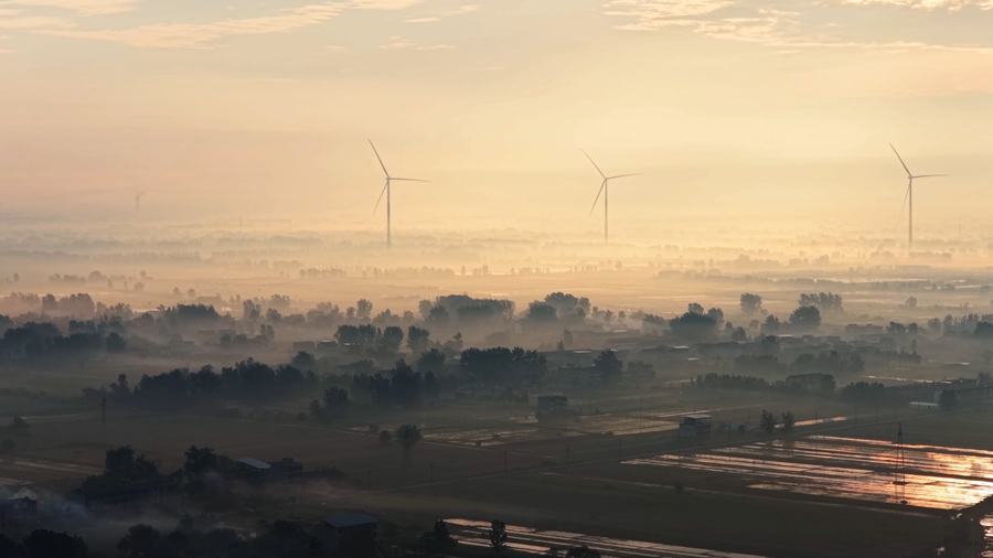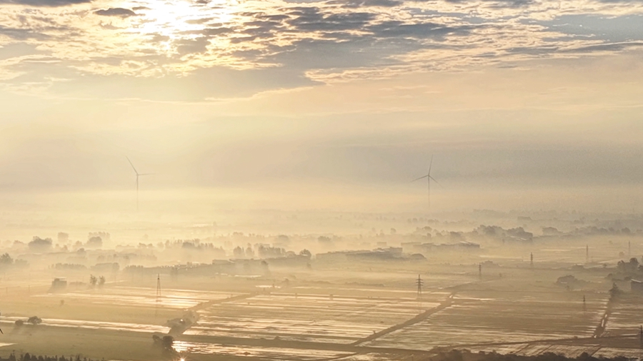 近日,晨光熹微,安徽省颍上县的田间乡野染上了一层油画般的色彩。远处的田地、民居、风力发电机等在金色的薄雾中若隐若现,犹如一幅美丽画卷。