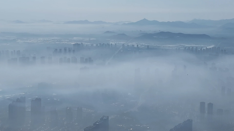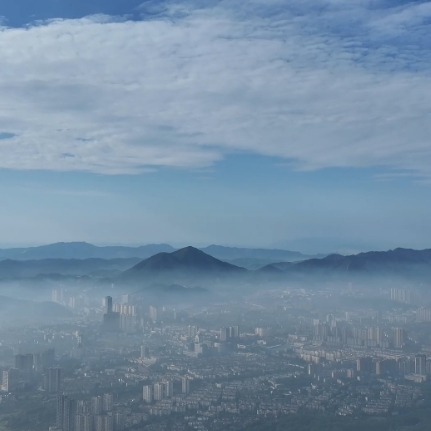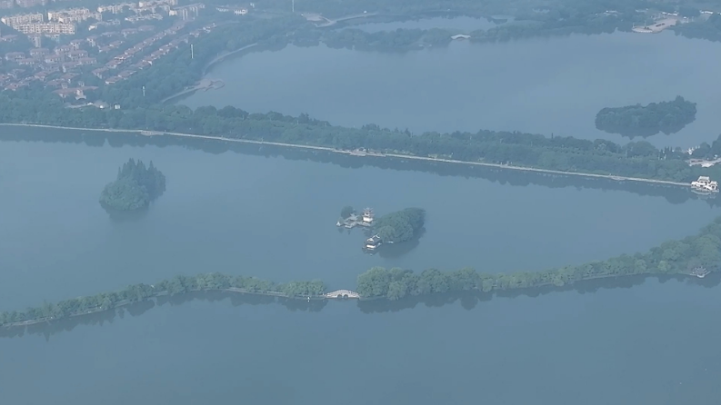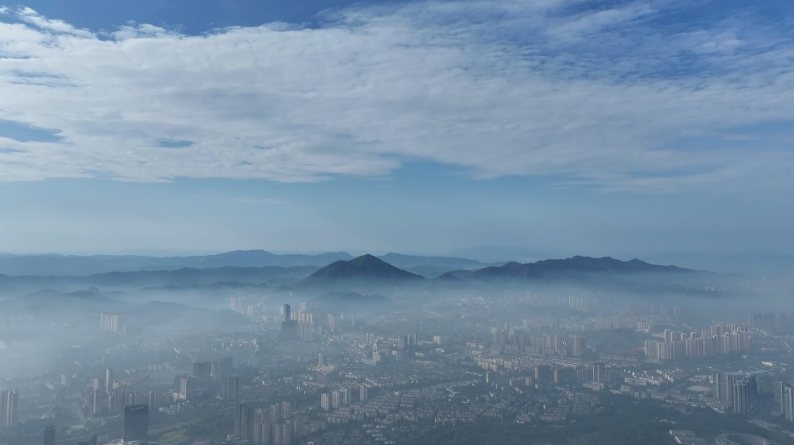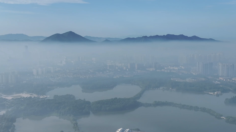 夏日清晨,安徽省铜陵市天井湖景区晨雾氤氲。湖面、高楼、远山掩映雾中,朦胧如画。