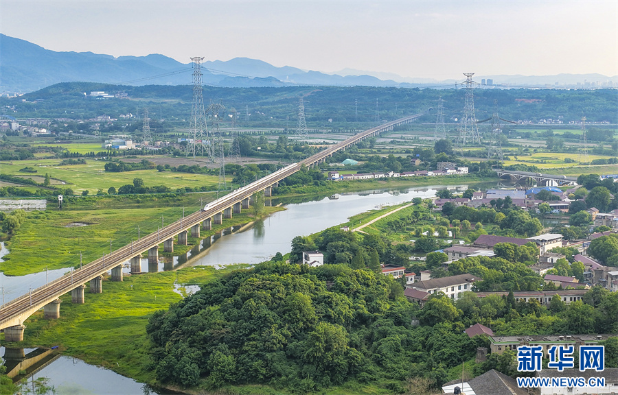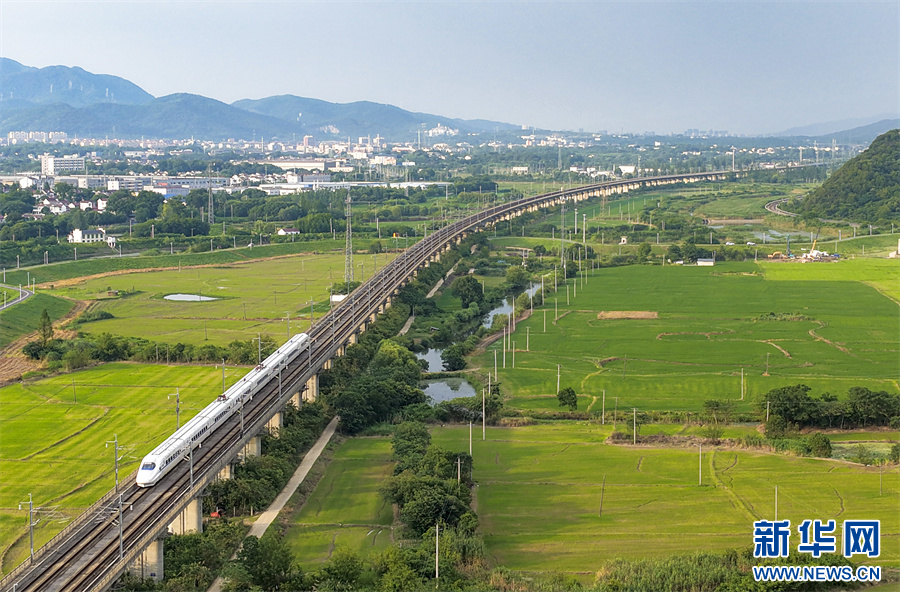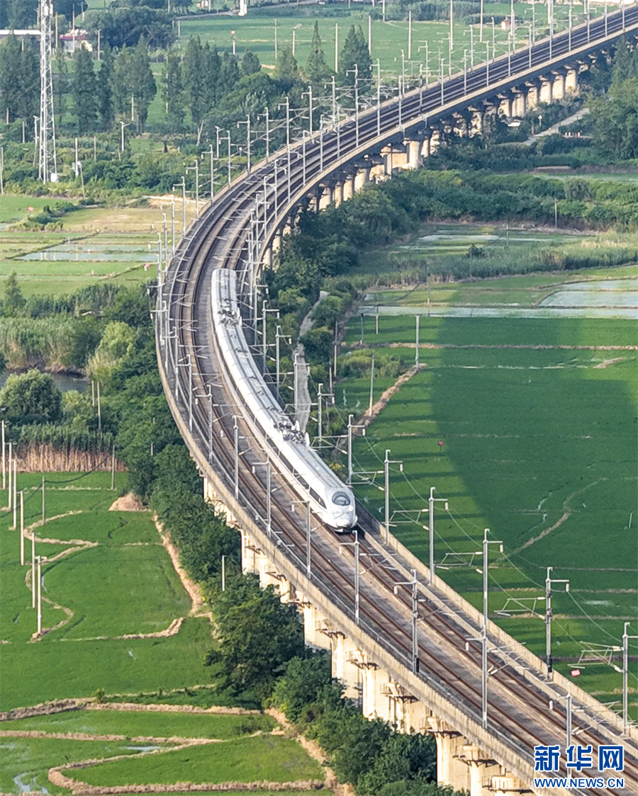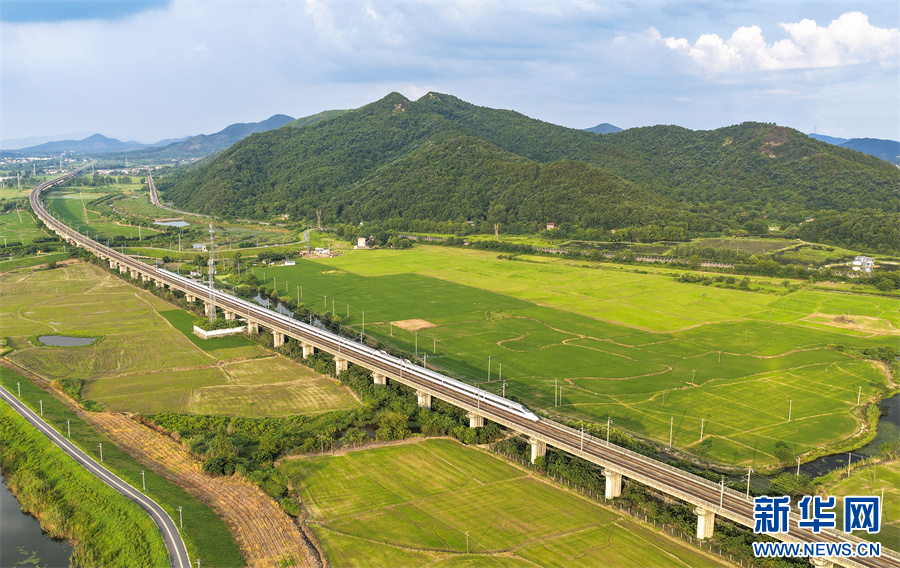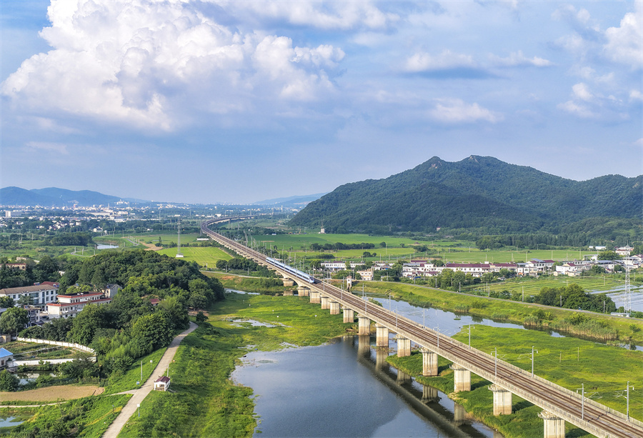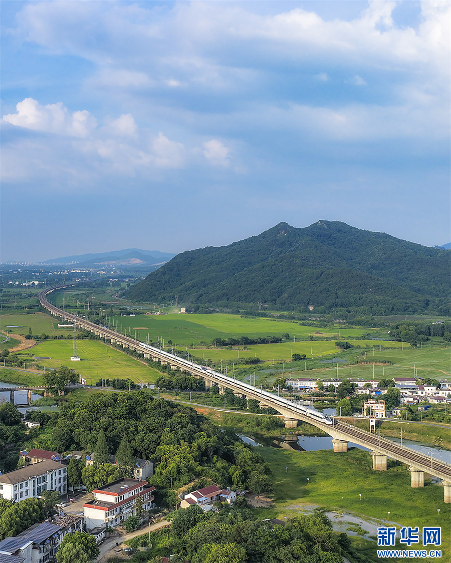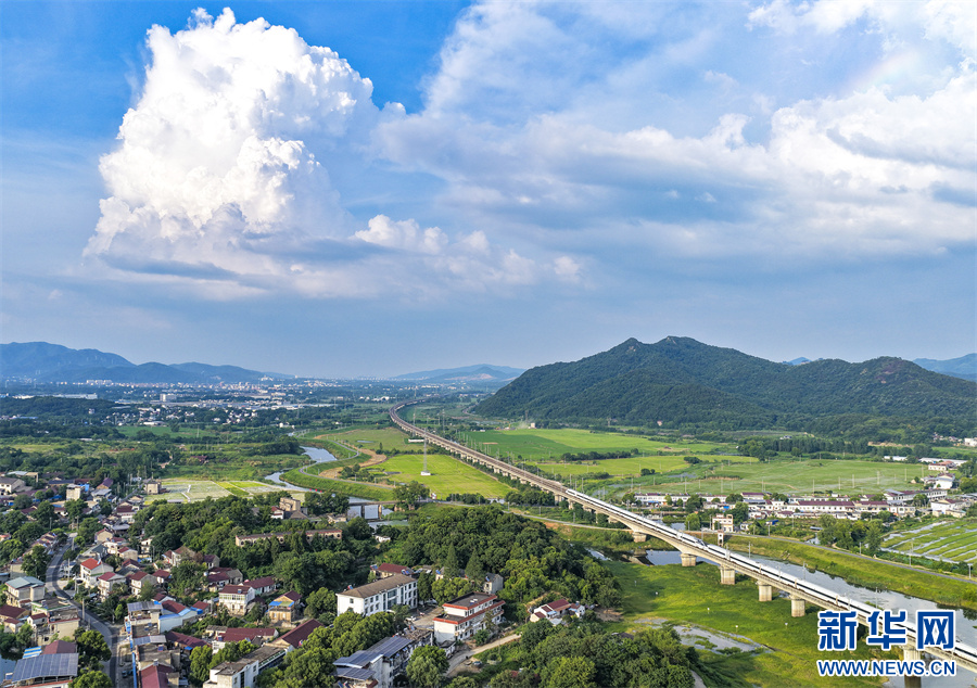 7月1日,安徽省芜湖市繁昌区孙村镇,高铁列车飞驰在广阔的田园上,与稻田、村庄、蓝天白云构成一幅秀美的乡村画卷。