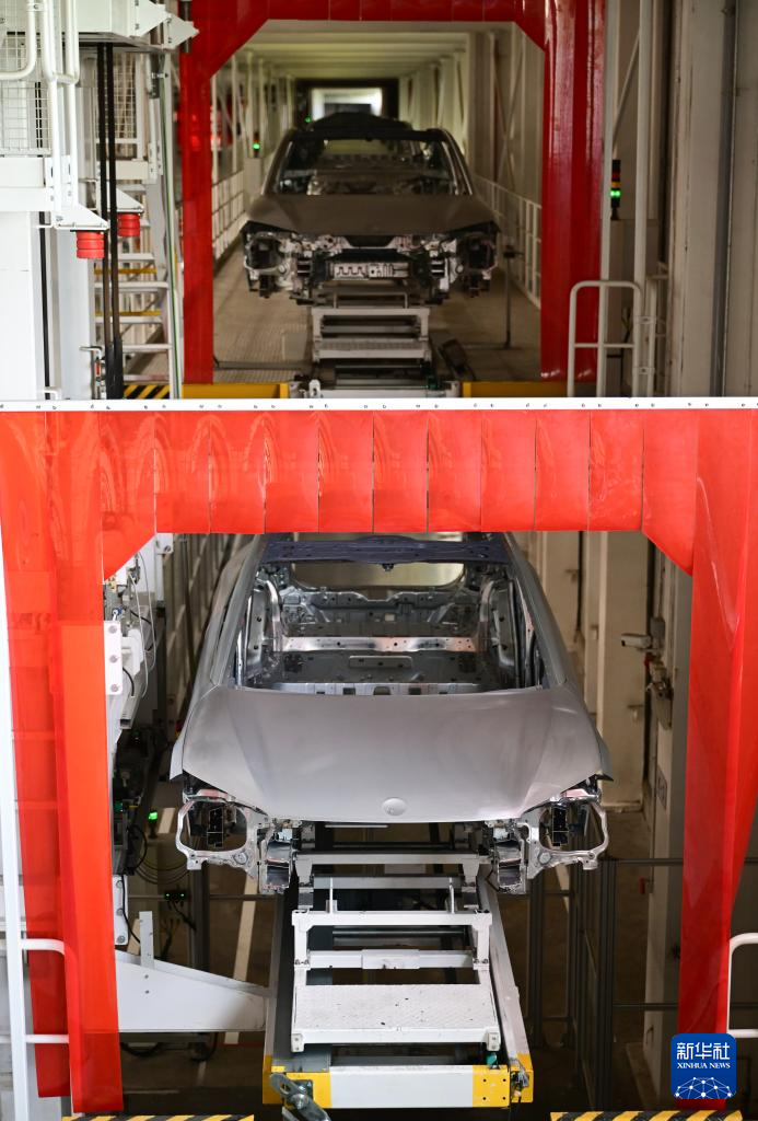 7月1日在合肥市新桥智能电动汽车产业园蔚来第二工厂拍摄的新能源汽车生产线。新华社记者 周牧 摄