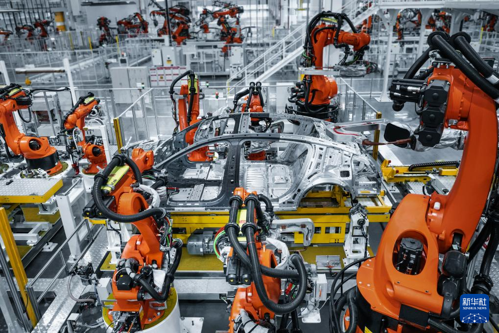 这是位于合肥市肥西县的江淮汽车尊界超级工厂内的自动化焊接生产线,该工厂是江淮汽车携手华为专门为尊界品牌打造的工厂。新华社发