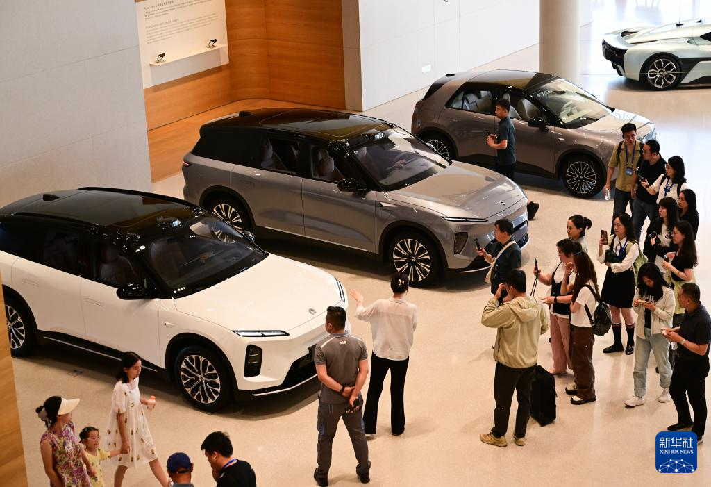 7月1日,在合肥市新桥智能电动汽车产业园蔚来第二工厂,媒体记者参观几款新能源汽车。新华社记者 周牧 摄