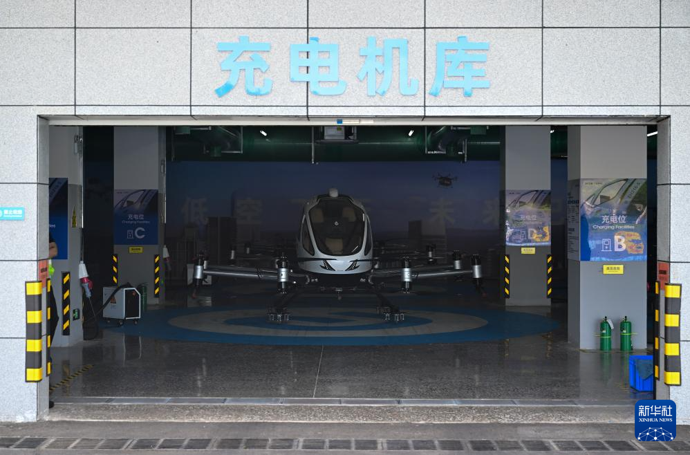 7月2日,在合肥骆岗公园,一架电动垂直起降飞行器(eVTOL)停放在充电机库中。