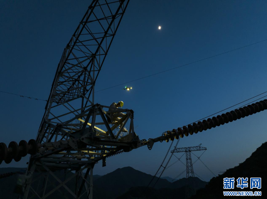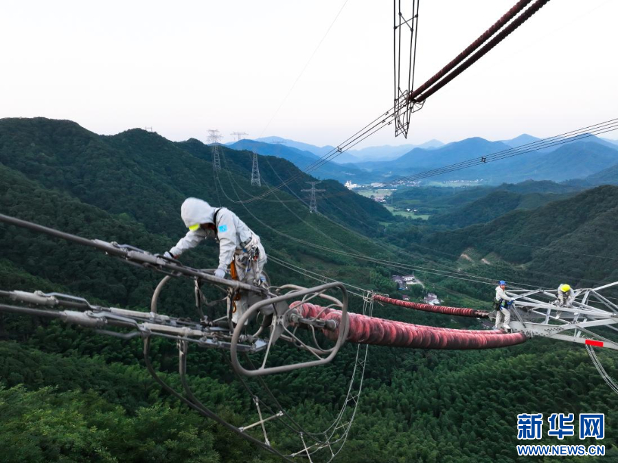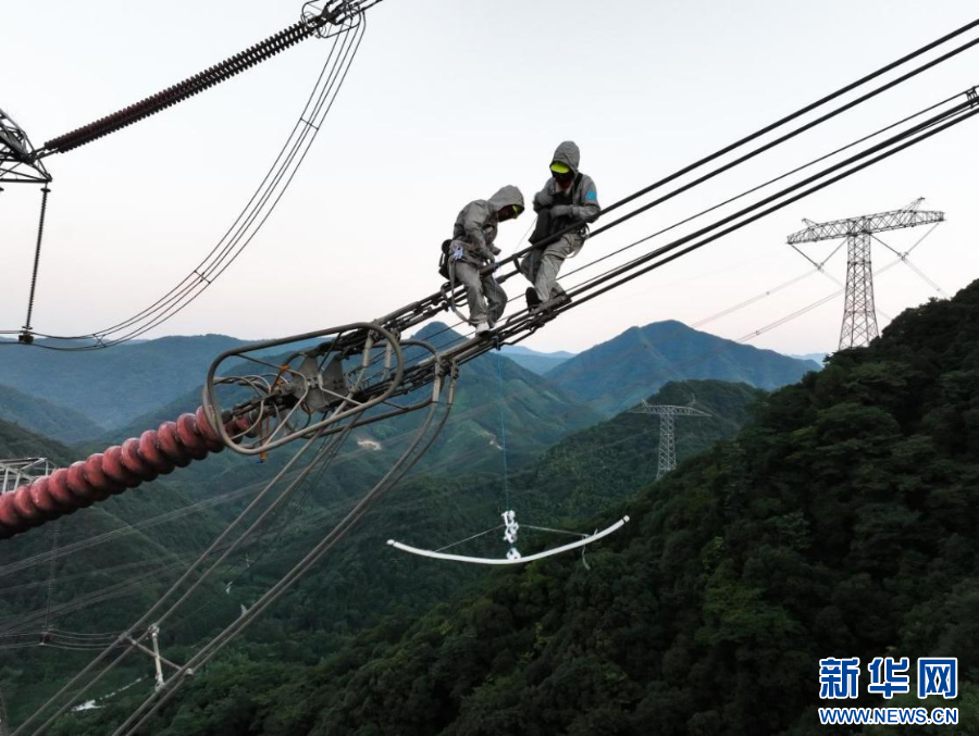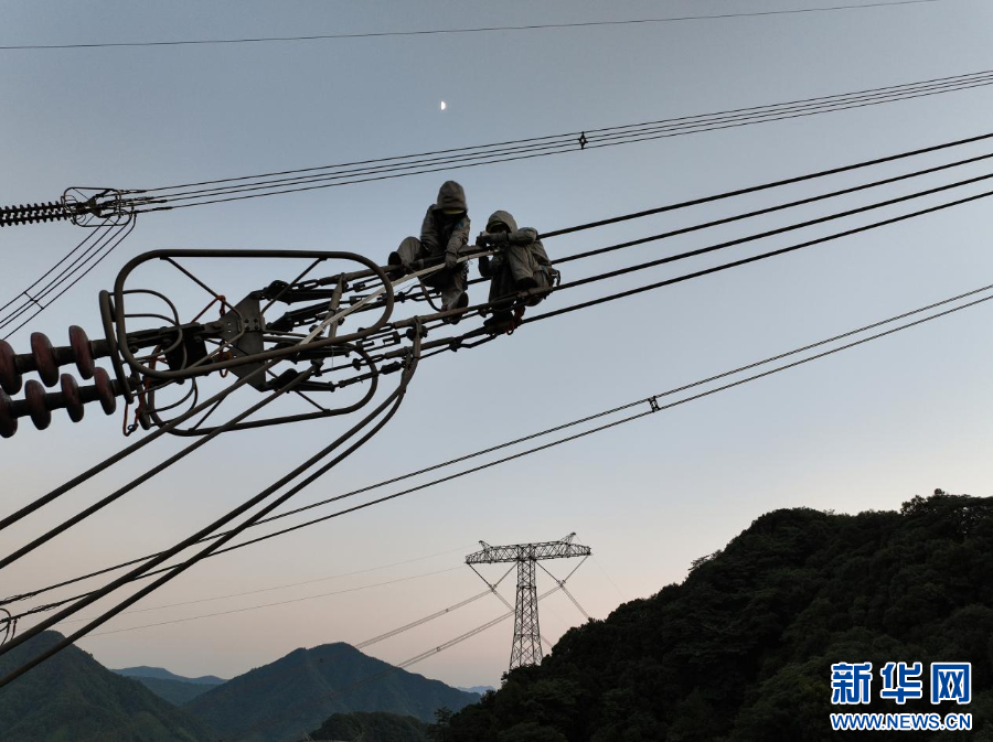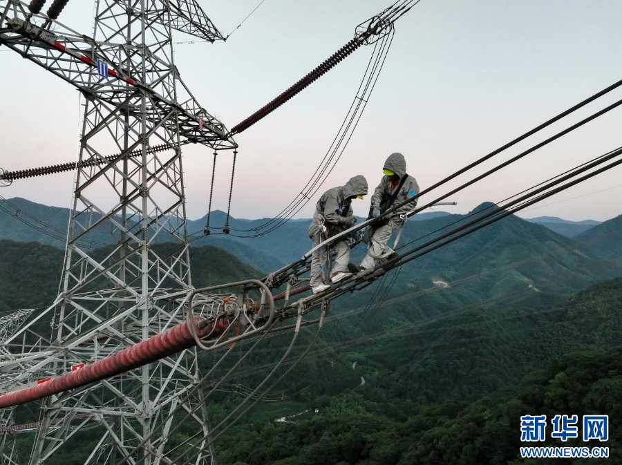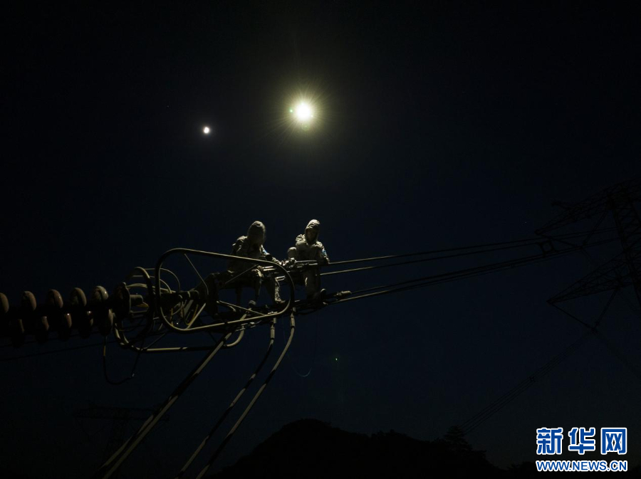 7月3日19时至21时许,在池州市贵池区梅街镇境内的大山深处,安徽送变电工程有限公司、国网池州供电公司联合开展带电作业,成功消除±500千伏林枫线1358号塔导线端3处异常发热危急缺陷,保障迎峰度夏期间西电东送能源大动脉安全稳定运行。新华网发(赵献富 摄)