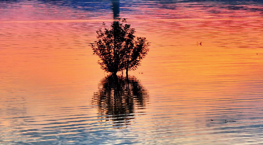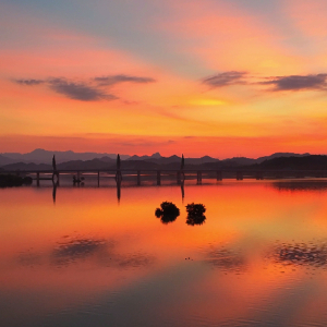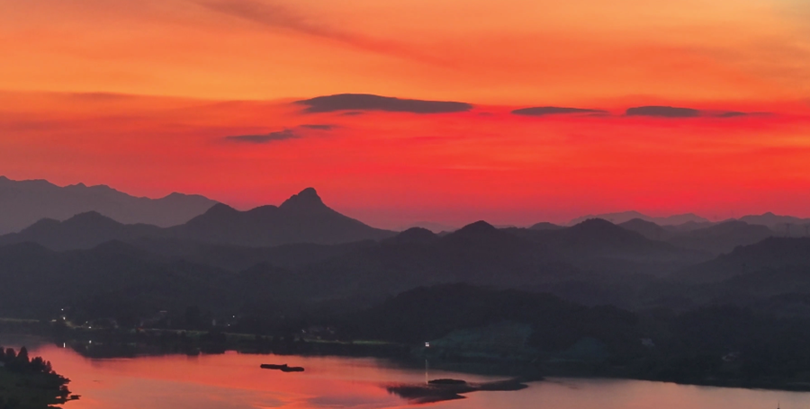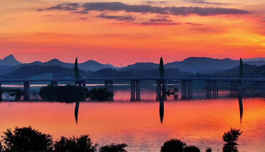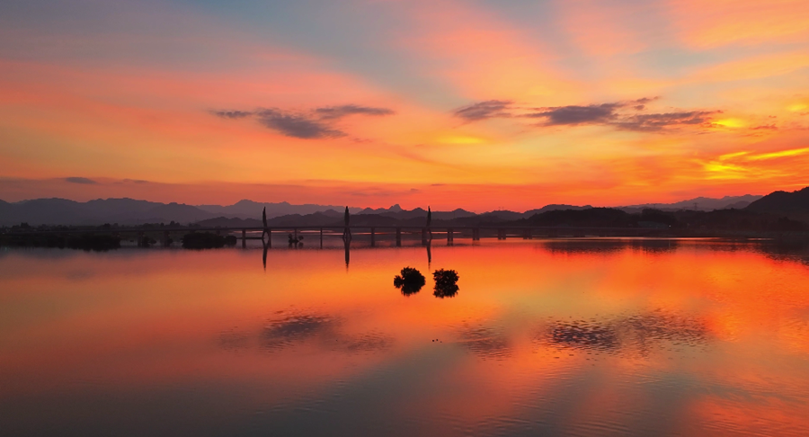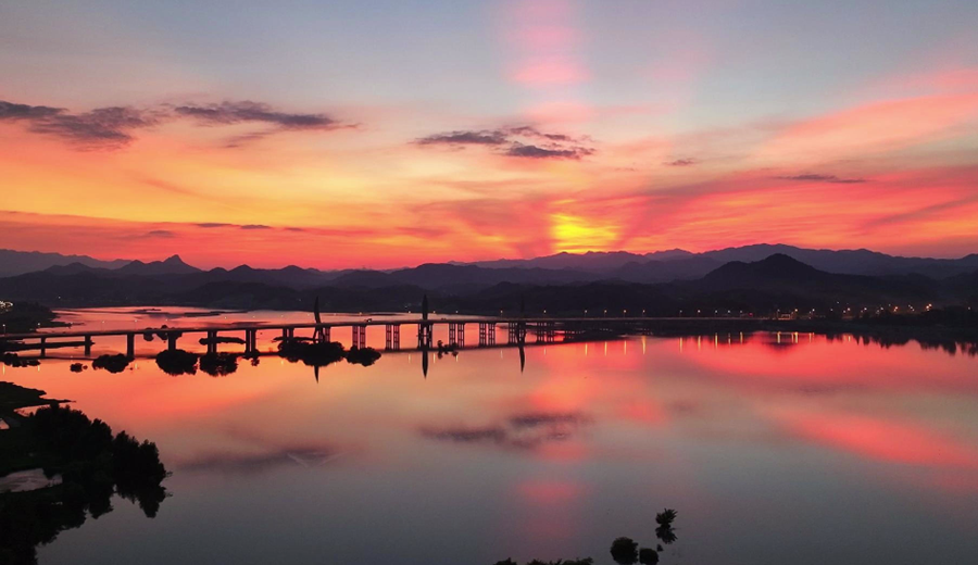 近日,在安徽省霍山县东淠河特大桥附近水面上,晚霞晕染天际,水天一色,美得令人心醉。(刘正祥)