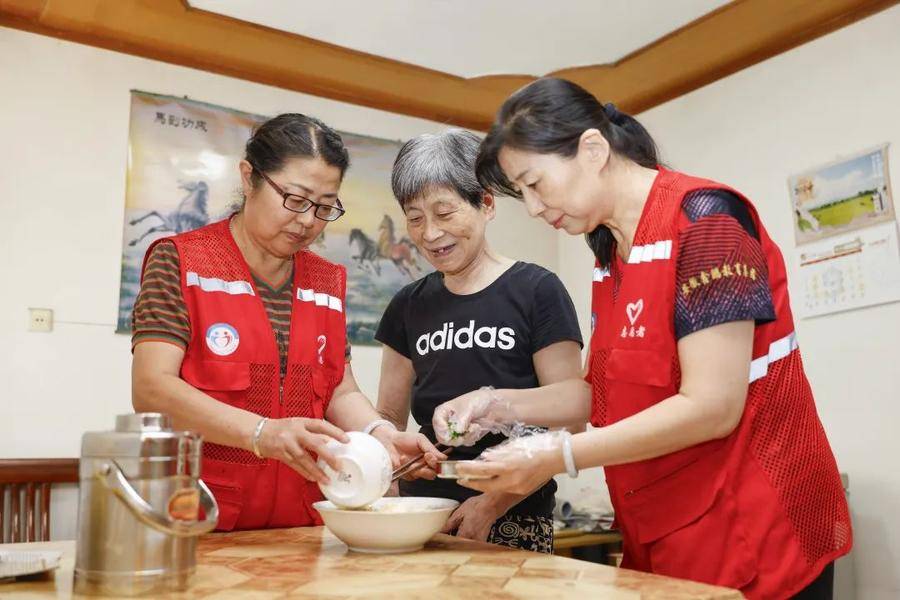 志愿者为居民送上长寿面,传递关怀与祝福。