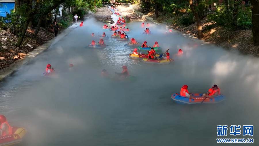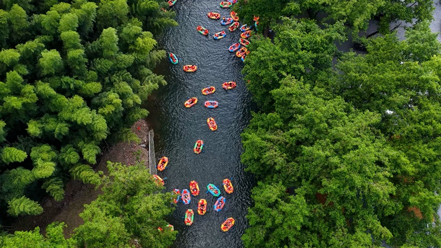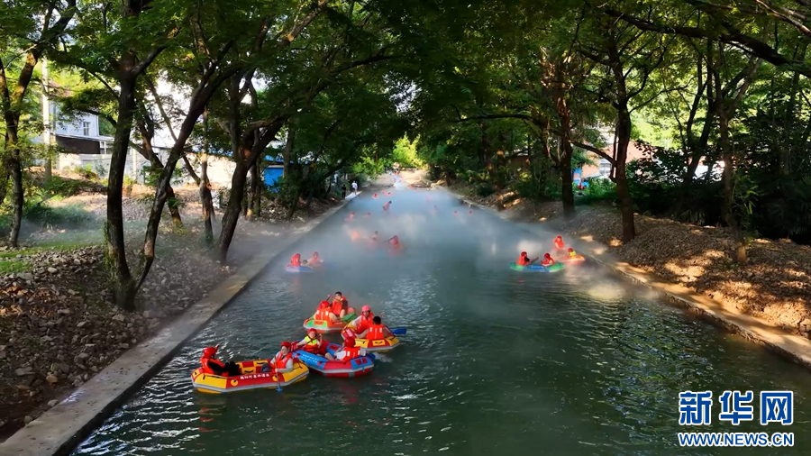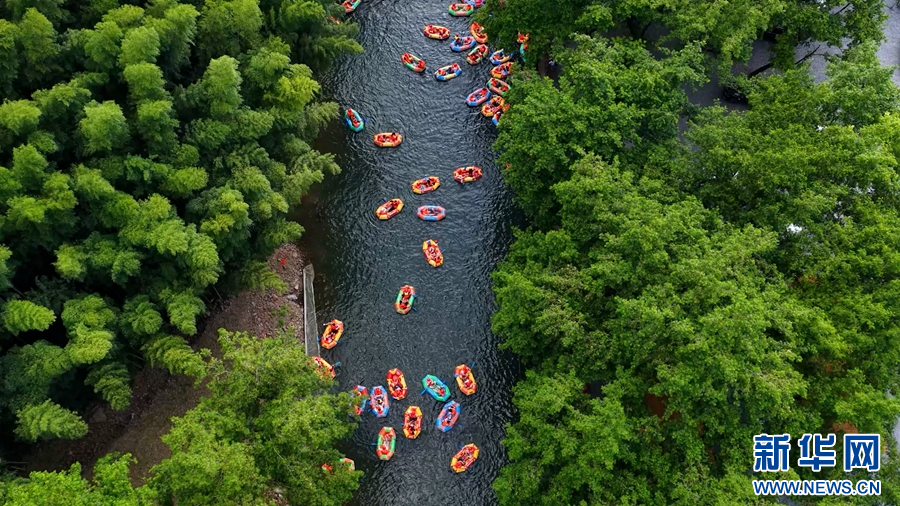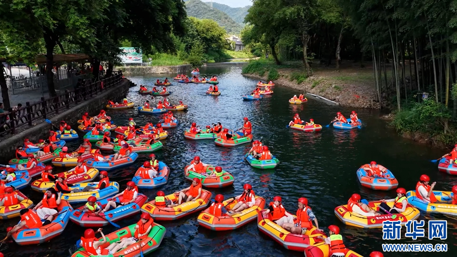 炎炎夏日,热浪袭人,安徽省宣城市水东镇朝阳河漂流景区凭借独特的林荫河道,成为众多游客避暑纳凉的热门选择。河道沿途白鹭驻足、鱼群游弋,两岸树冠交织成“绿色穹顶”,与水流形成双重降温效果,人们在此尽情享受林间嬉水带来的阵阵清凉。(李晓红)