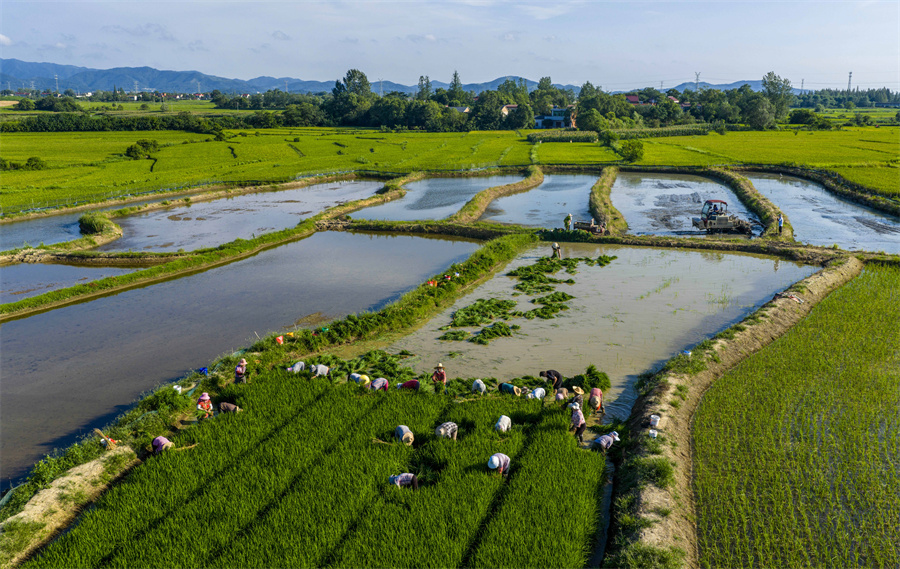 7月8日,安徽省合肥市庐江县柯坦镇枣岗村,农民在虾田里栽种水稻。