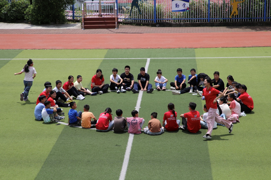 7月9日,在金寨县花石实验学校,滁州学院支教队员带领孩子做游戏。 曹纯摄