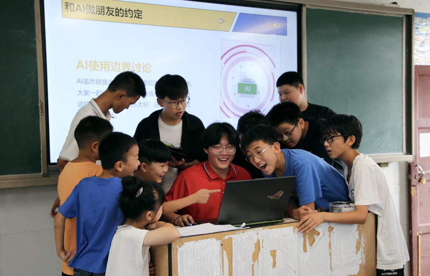 7月9日,金寨县花石实验学校,滁州学院支教队员教孩子们使用AI工具。 曹纯摄