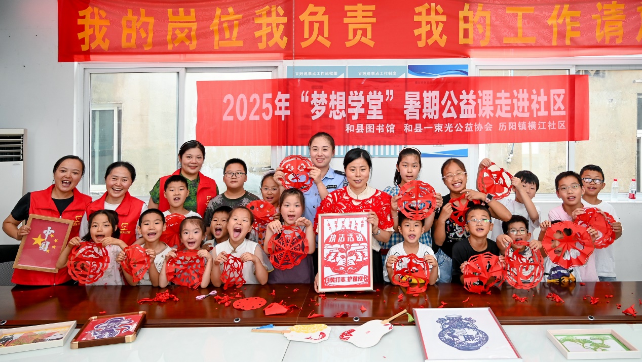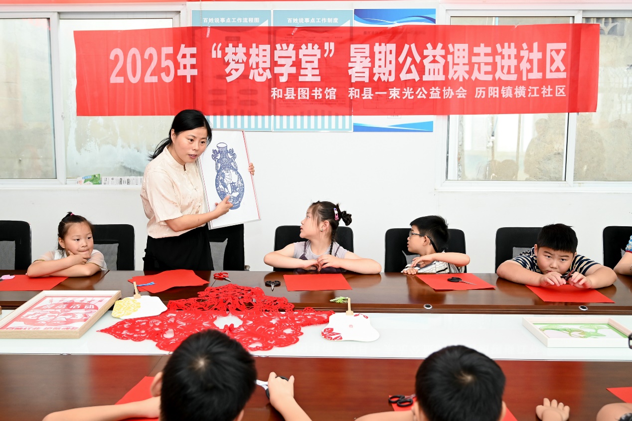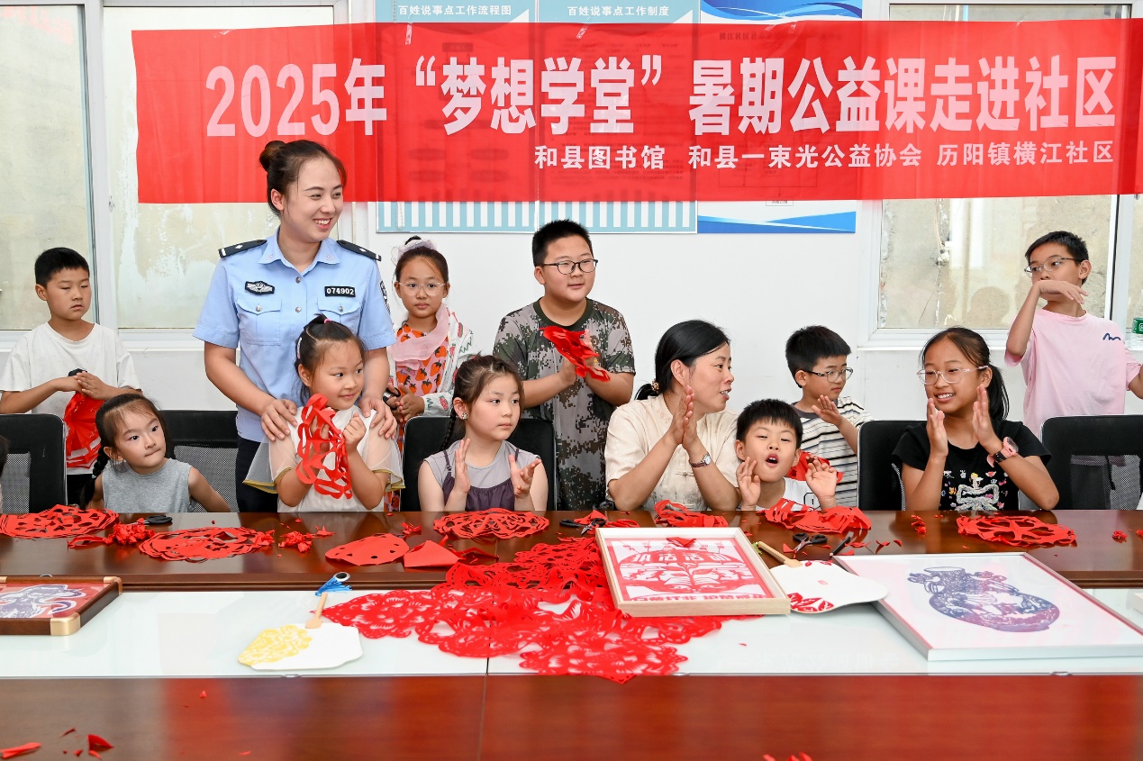 今年暑假,和县图书馆联合一束光公益协会,在历阳镇各社区的配合下,开设33场公益性“梦想学堂”,内容涉及剪纸、戏曲、文学、防溺水等知识,让孩子们快乐安全过暑假。(秦祖泉 )