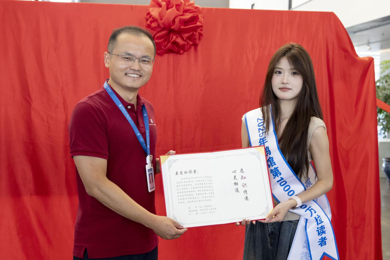 能成为该馆的第100万位幸运读者,汪女士难掩兴奋,她表示,最近听说这里的沉浸式阅读展很有特色,特意趁周末前来打卡,没想到成为了“百万读者”,“环境好、活动多,以后肯定常来。”汪女士不仅收获了这份惊喜,还收到了“百万读者VIP”限定卡及合肥市中心图书馆限定文创礼盒。作为百万幸运读者,汪女士在该馆可以一次性可借阅100本书籍,所有活动可免预约参加。