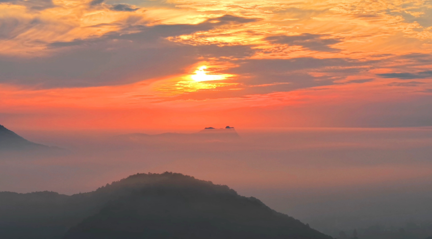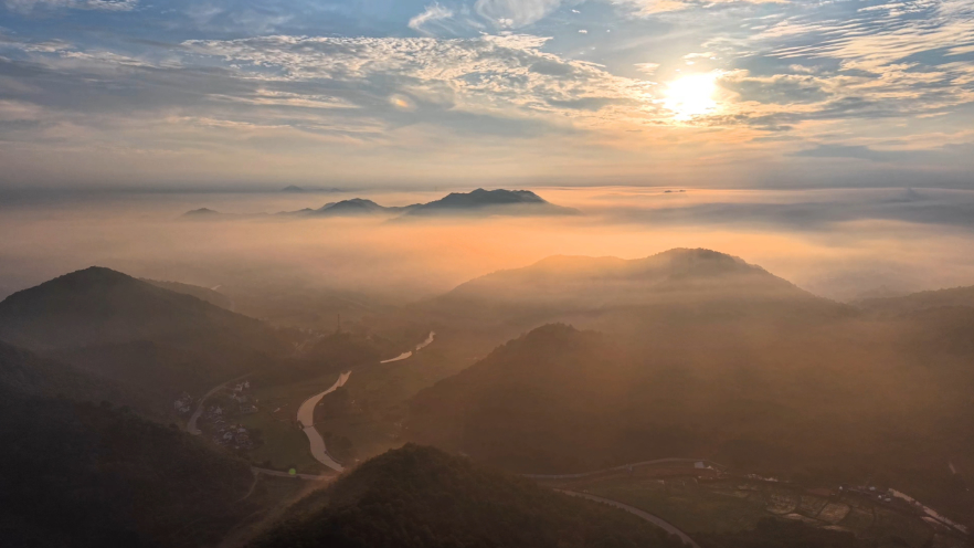 清晨登高,可赏云海日出,金色的光芒映照山峦,云雾缭绕其间,仿佛一幅壮丽的山水画卷。