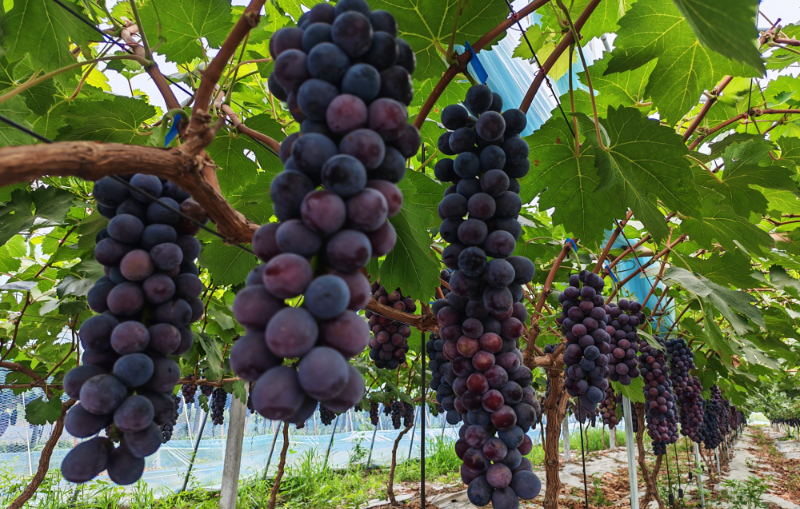 盛夏来临,又到了大棚葡萄成熟的季节。在固镇县新马桥镇胡洼村的葡萄园里,夏黑葡萄进入成熟采收季,一串串饱满晶莹的的葡萄挂满枝头,浓郁果香弥漫整个果园。