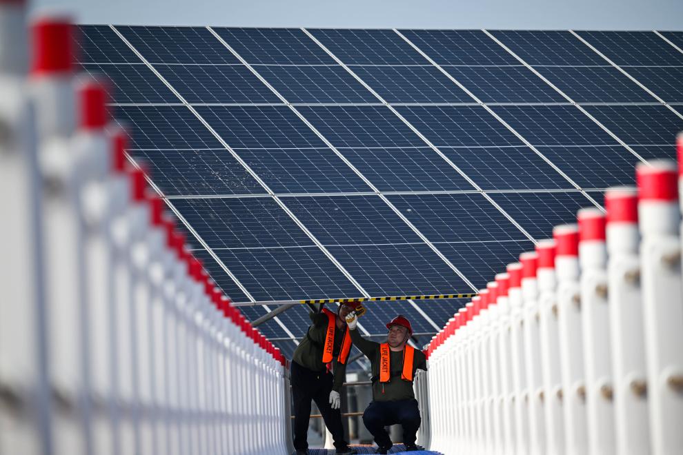 7月10日,在国家能源集团天津龙源新能源有限公司渤化光伏电站,工作人员在检查光伏发电板。新华社记者赵子硕 摄