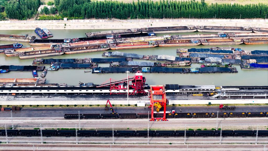 6月8日,在济宁港航梁山港,船舶停靠等待装运煤炭(无人机照片)。新华社记者郭绪雷 摄