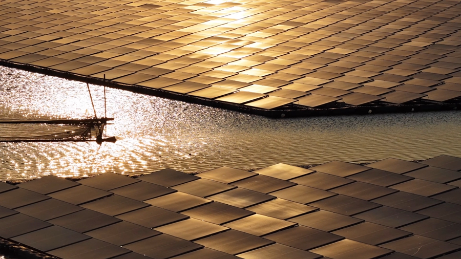 夏日时节,在安徽省颍上县的刘庄煤矿塌陷区,夕阳下的水上漂浮式光伏发电板熠熠生辉,蔚为壮观。