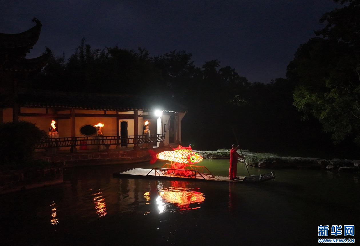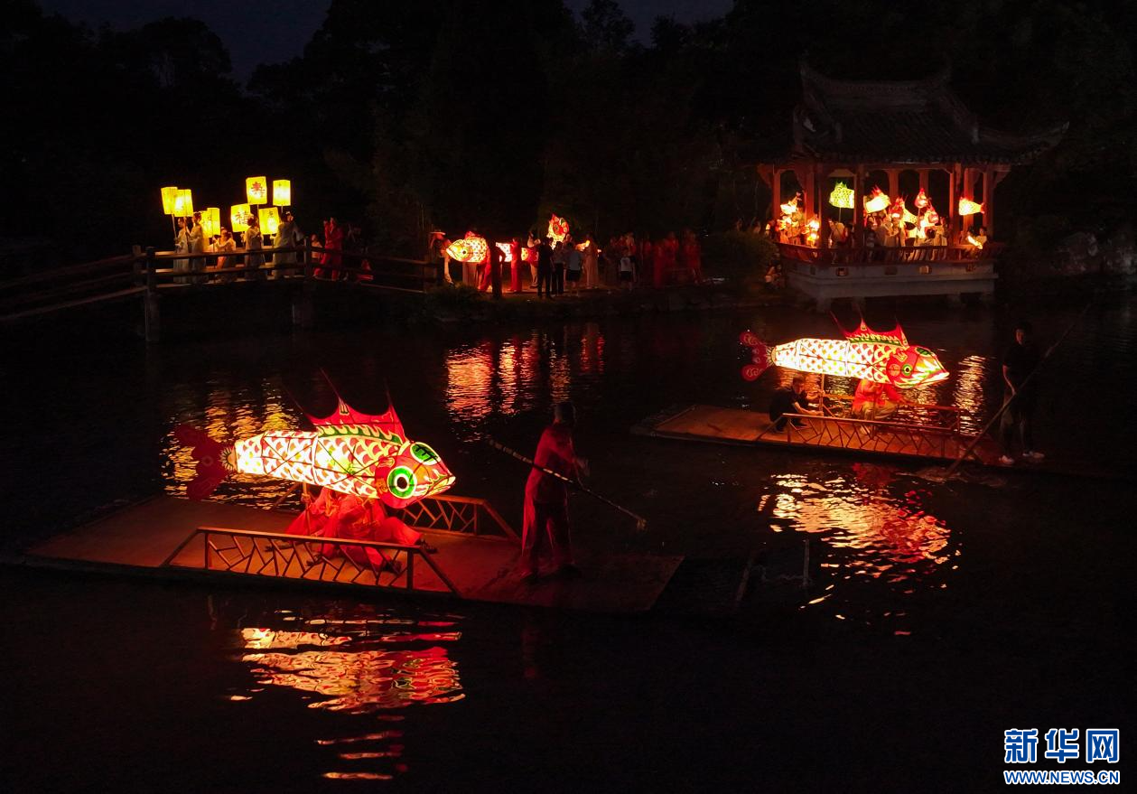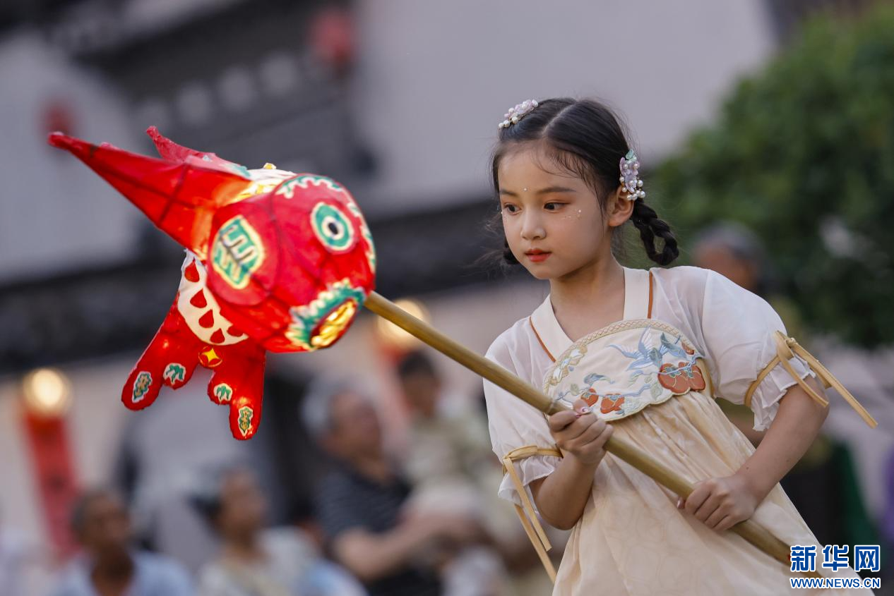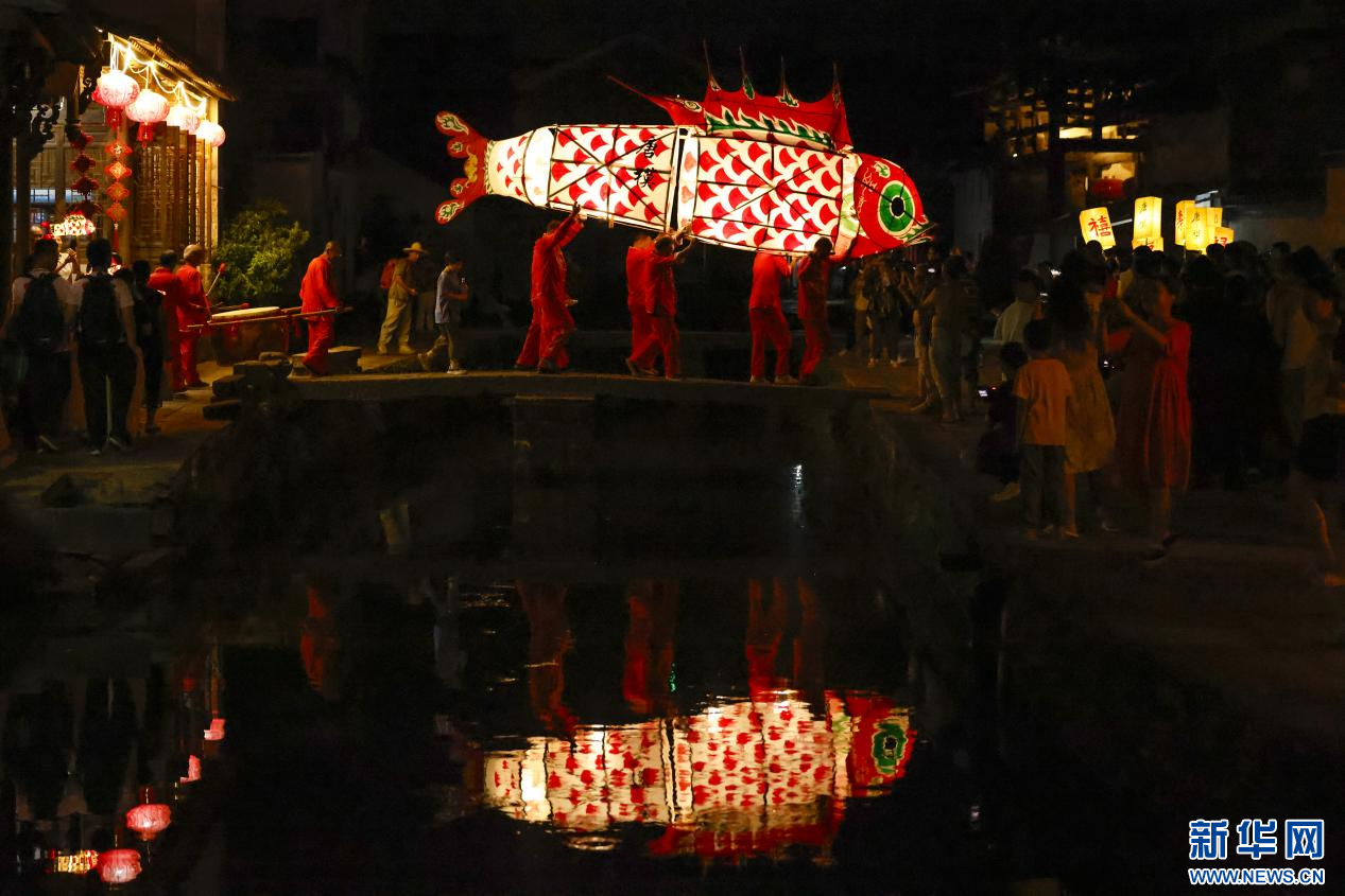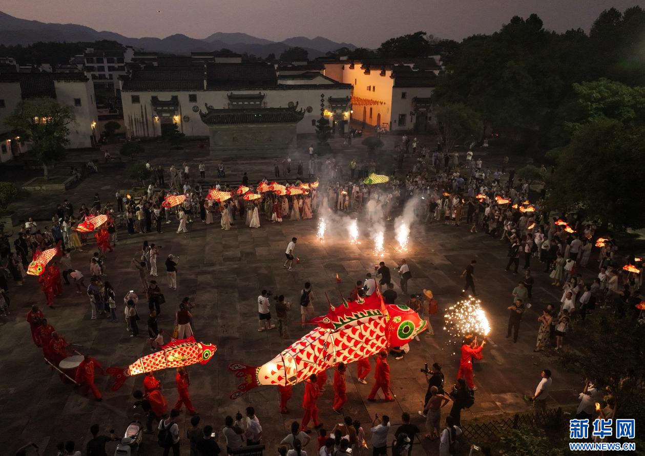 当日,一场热闹非凡的鱼灯夜游会在安徽省黄山市徽州区潜口镇唐模古村上演,惟妙惟肖的鱼灯在古村中穿梭游弋,流光溢彩,吸引众多游客前来观赏、体验,点燃暑期夜经济。新华网发(施亚磊 摄)