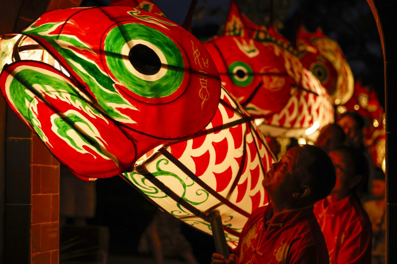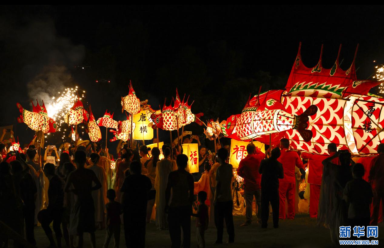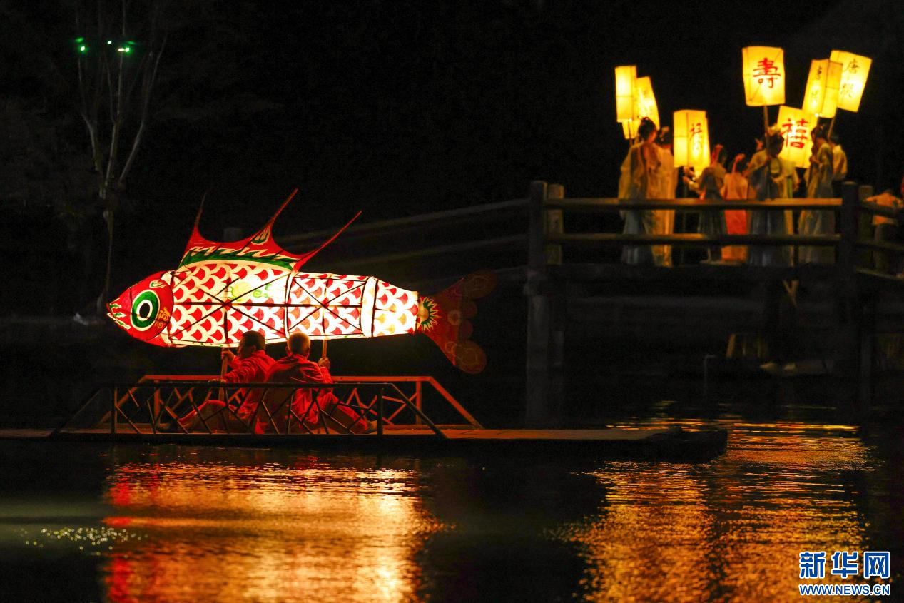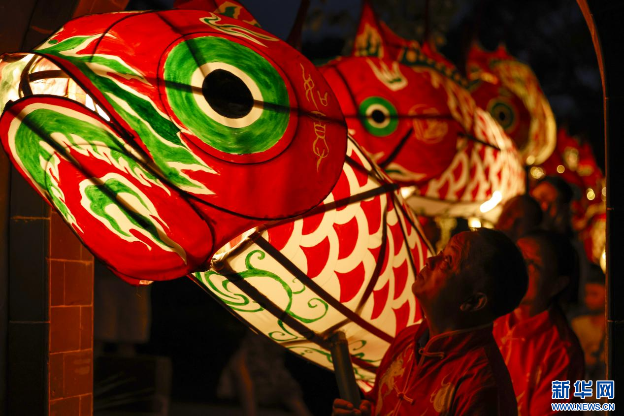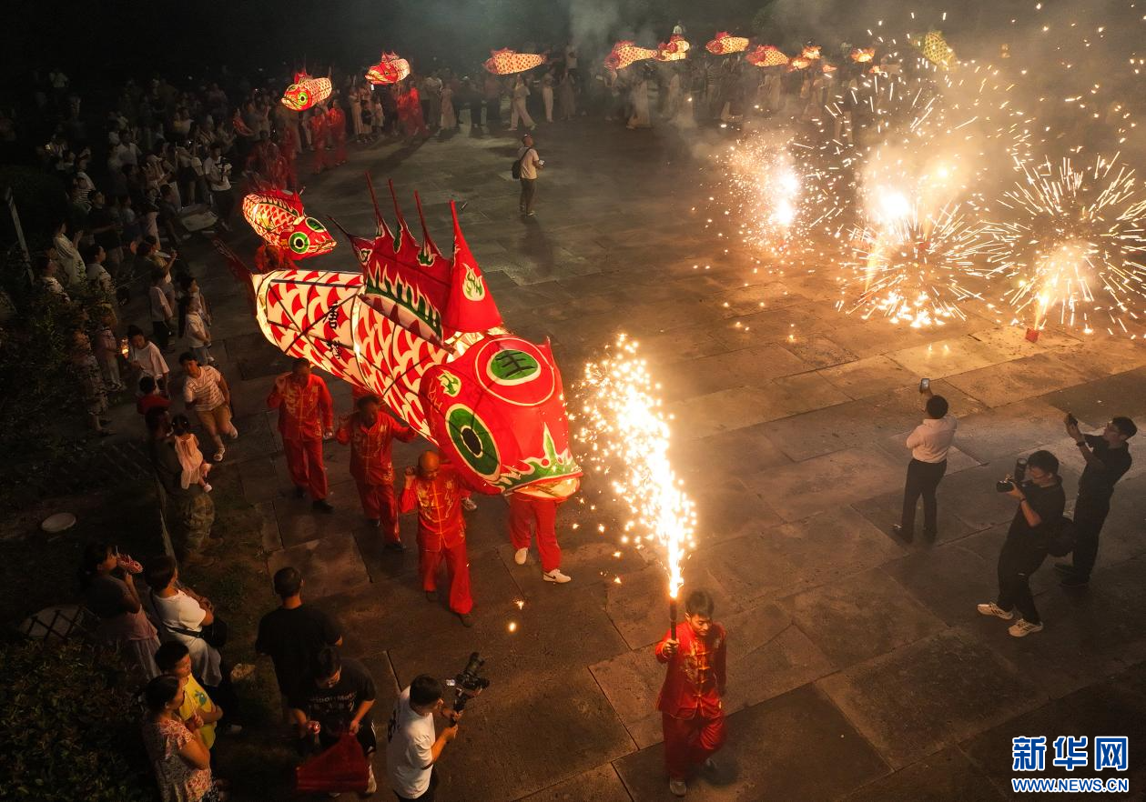 当日,一场热闹非凡的鱼灯夜游会在安徽省黄山市徽州区潜口镇唐模古村上演,惟妙惟肖的鱼灯在古村中穿梭游弋,流光溢彩,吸引众多游客前来观赏、体验,点燃暑期夜经济。新华网发(施亚磊 摄)