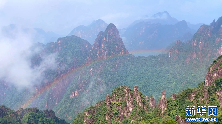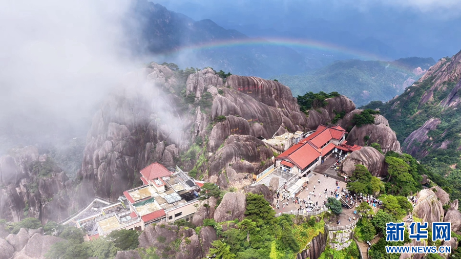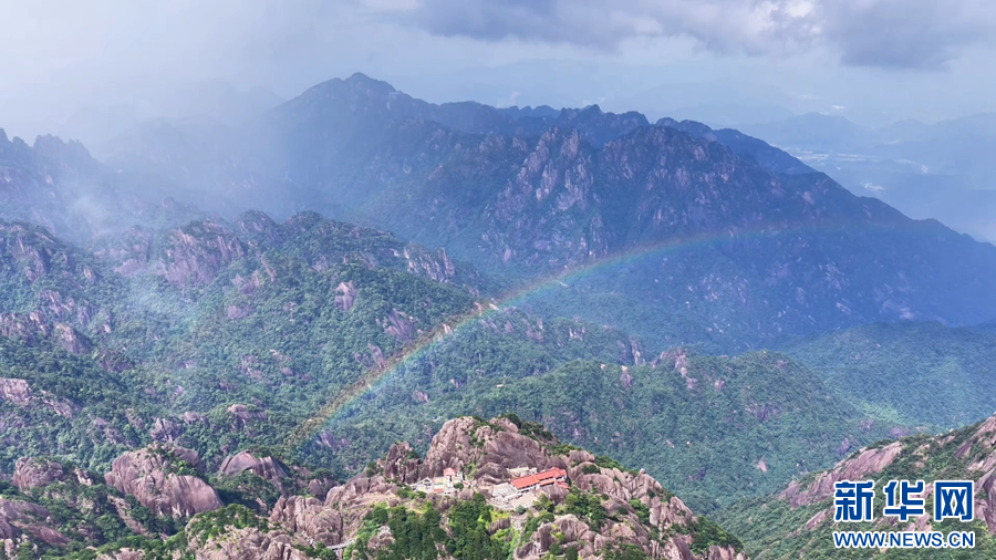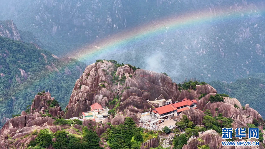 近日,黄山风景区雨后出现彩虹,七色彩虹宛如天空之桥,轻盈地横跨于青峰翠壑之上,勾勒出一幅如梦似幻的夏日画卷。(侯瑞冬 姚育青)