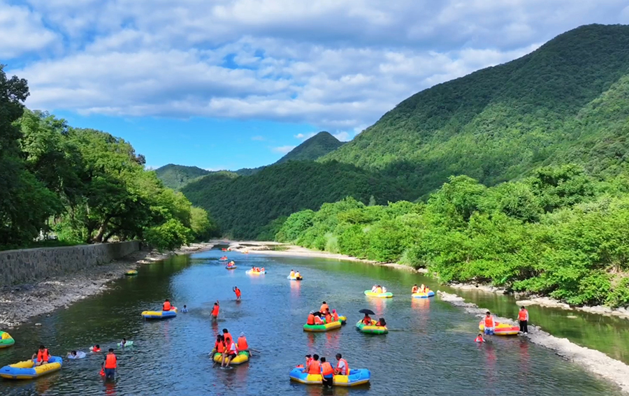 炎炎夏日,安徽省石台县迎来避暑旅游高峰。在秋浦河西黄山漂流,游客们乘着彩色皮筏漂流戏水,清澈的河水与葱茏的山林相映成趣,构成一幅动人的消夏图景。(王帆 摄)