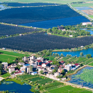 7月20日,安徽省芜湖市繁昌区平铺镇岱湖滩渔光互补光伏电站与田园、水面等相映成景,构成一幅绿色生态画卷。