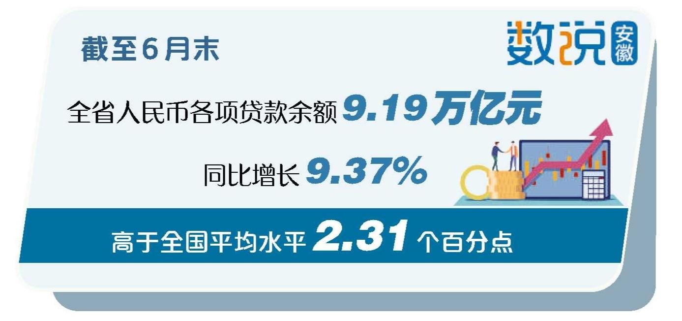 7月25日,记者从中国人民银行安徽省分行获悉,截至6月末,全省人民币各项贷款余额9.19万亿元,同比增长9.37%,高于全国平均水平2.31个百分点,较年初增加5896.90亿元。