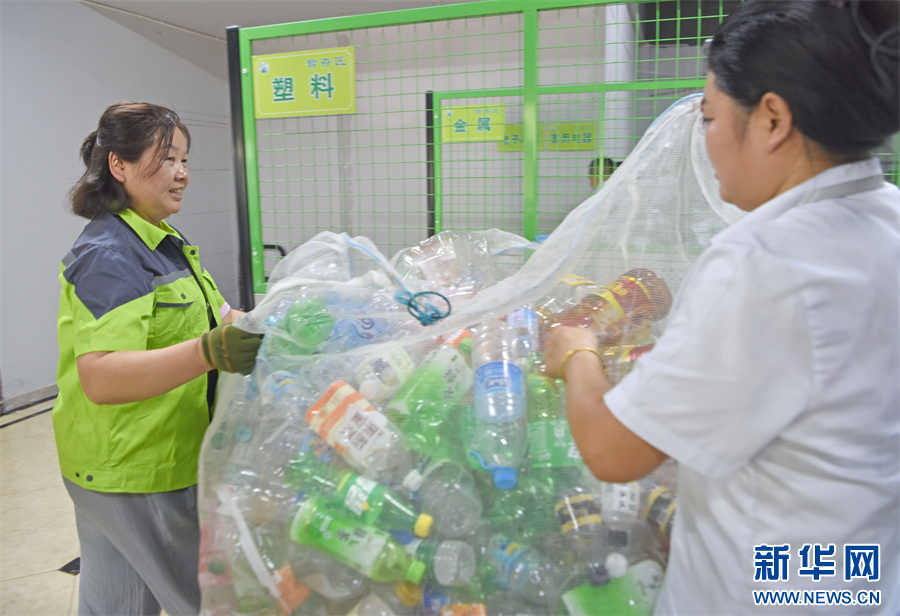 7月24日,在一家再生资源回收网点综合回收门店内,工作人员对再生资源进行分类。
