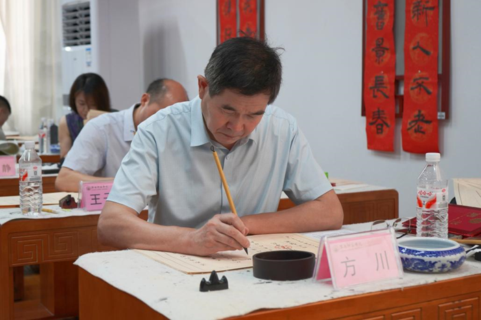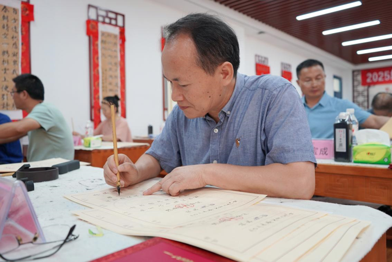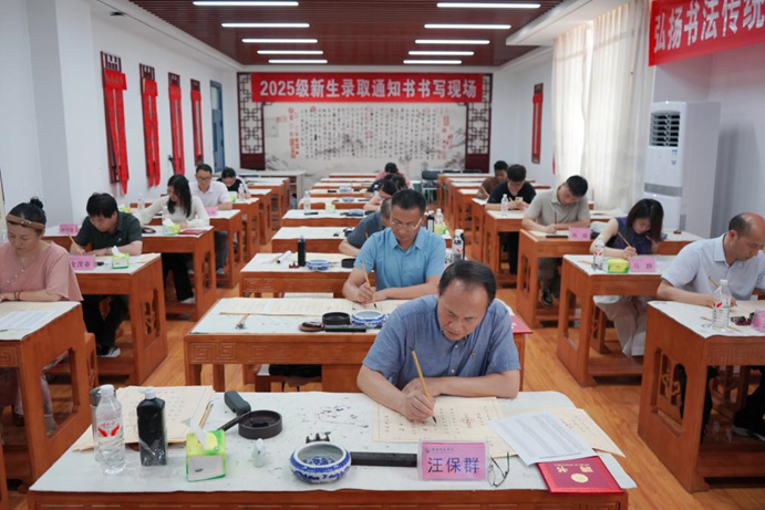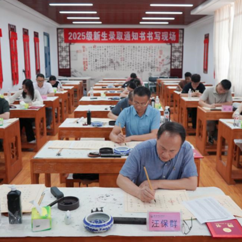 师生们正伏案挥毫,在特制宣纸上为2025级新生手书录取通知书。