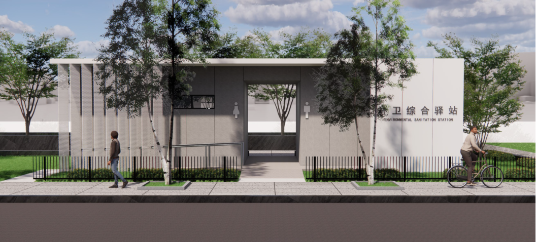 公共厕所设计采用钢结构形式,通过装配式建造技术能够节省大量时间,且绿色低碳。立面采用造价低、耐用度高、便于施工的装饰砂浆,优选低饱和度的色彩,使公厕与城市绿化相融合,实现“显眼”不“扎眼”。