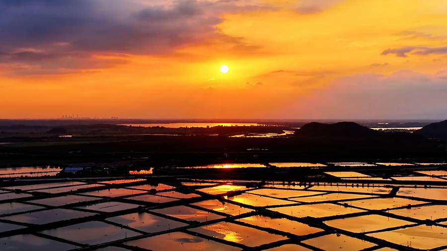 7月27日,傍晚时分的安徽省池州市青阳县新河镇童埠圩,夕阳似金纱铺落田间,一块块鱼塘宛如天然镜面,跃动起粼粼金光,远山轮廓在霞光中朦胧晕开,交融成一幅静谧的乡村画卷。(储成胜)
