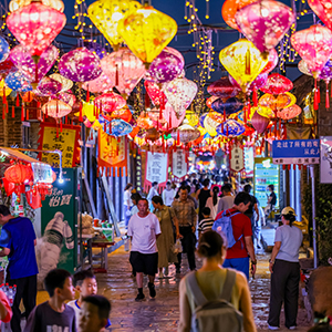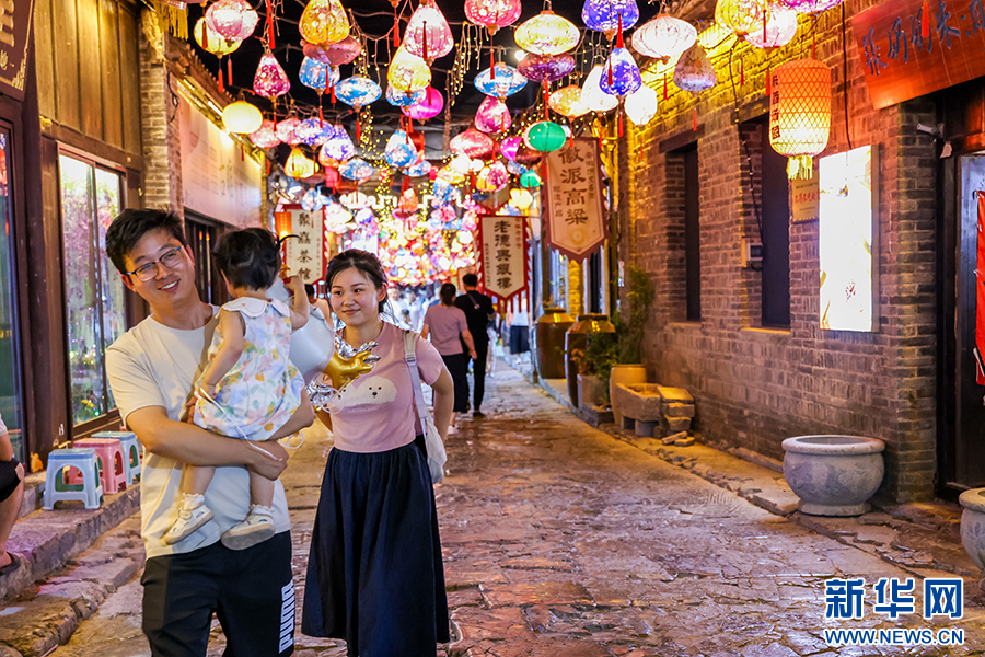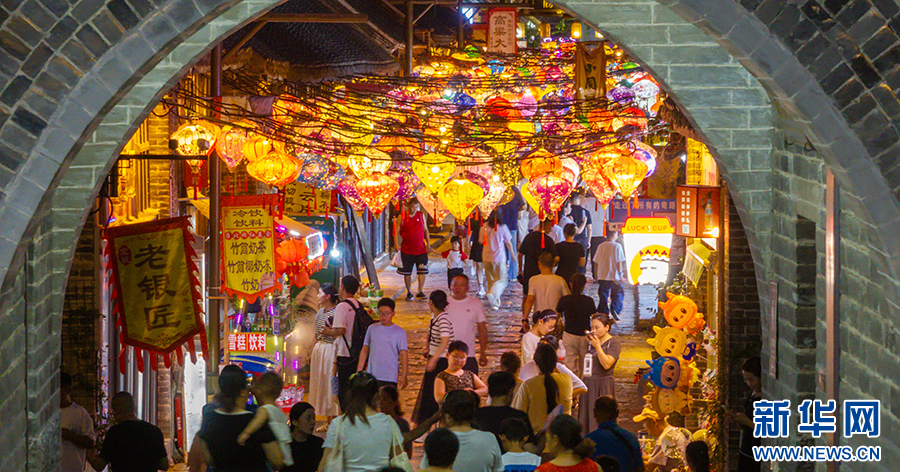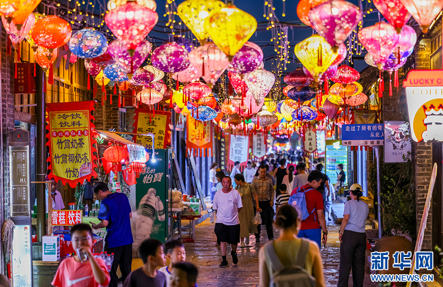 近年来,安徽省淮北市濉溪县对古城石板街进行了整体提升改造,打造夜食、夜娱、夜购等场景,让“夜经济”持续升温。进入暑期以来,石板街客流量攀升,多样化消费场景释放夏日经济活力。新华网发(王文 摄)