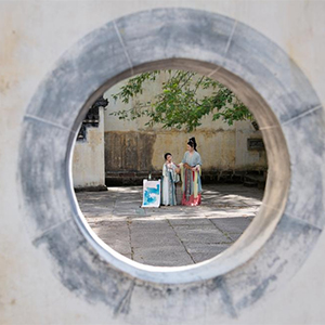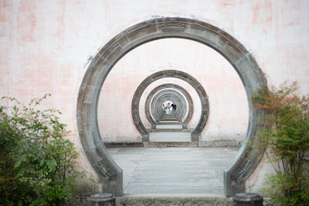 7月25日,游客在安徽省黄山市徽州区呈坎村留影。新华社记者 张端 摄