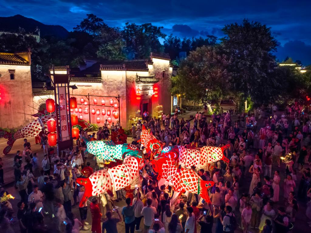 7月25日,在安徽省黄山市徽州区呈坎村,非遗鱼灯巡游活动吸引游客前来观赏。新华社记者 张端 摄
