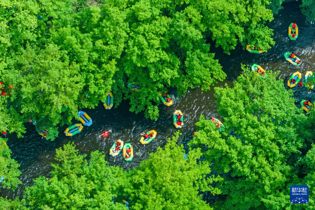 游客在滁州市皇甫山国家森林公园漂流(2024年5月19日摄,无人机照片)。