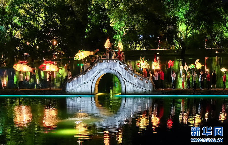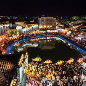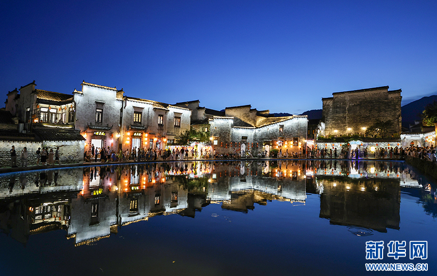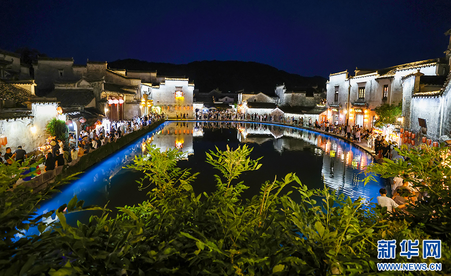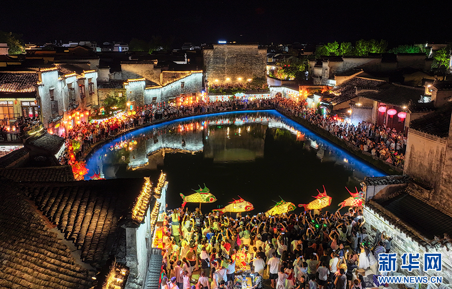 8月13日晚,安徽省黄山市黟县宏村流光溢彩,花灯夜游表演吸引众多游客前来参观、游玩。