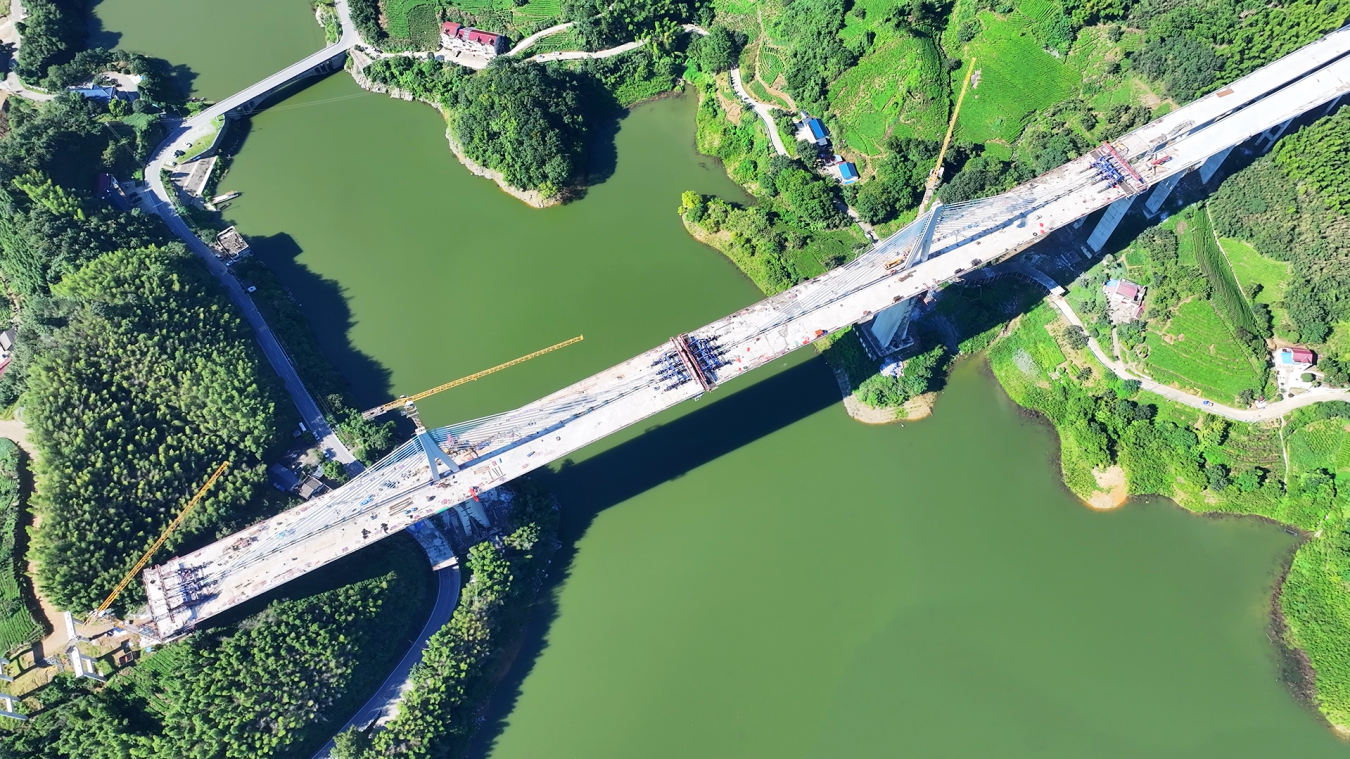 在碧波荡漾的响洪甸水库西南角,一座造型独特的特大桥巍然耸立——鲜花湖特大桥。其标志性的剪刀X型双支薄壁桥墩,宛如一朵盛放的鲜花,点缀于青山绿水之间。