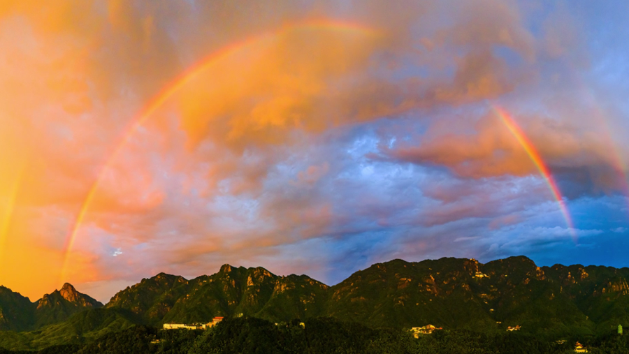 8月21日,安徽省九华山风景区雨后出现壮美的“双彩虹”景观,宛如彩带横跨天空,梦幻又美好。(饶治国、杨银龙、叶志)