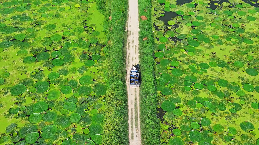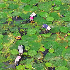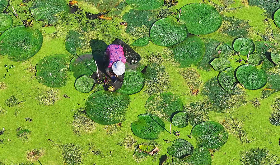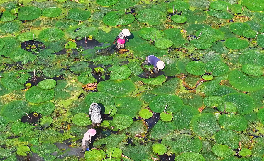 近日,安徽省全椒县六镇镇芡实种植基地迎来采收季。采摘工人们穿梭于芡实塘间,采收颗粒饱满的芡实,呈现出一派丰收的繁忙景象。(周心怡 张帆)